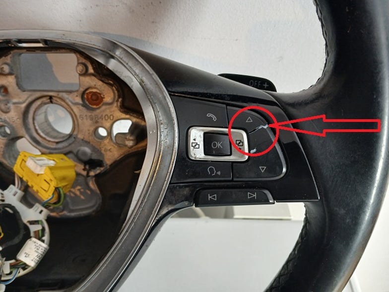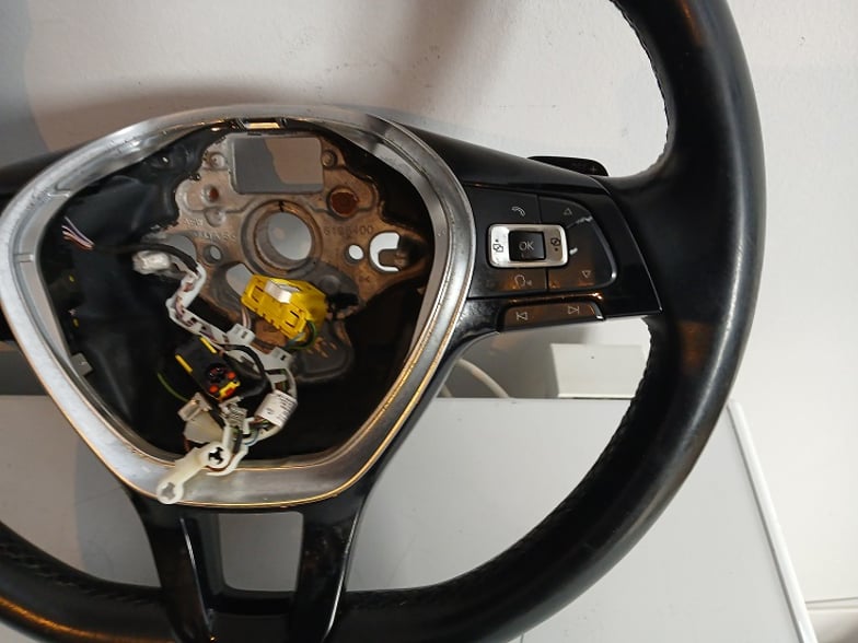 SPRZEDAM KIEROWNICĘ SKÓRA MULTIFUNKCJA ŁOPATKI DSG O OZNACZENIU 5G0419091 DO SAMOCHODU VW PASSAT B8. W KIEROWNICY PĘKNIĘTE DWA PRZYCISKI OD MULTIFUNKCJI WSZYSTKIE USZKODZENIA WIDOCZNE NA ZDJĘCIU.