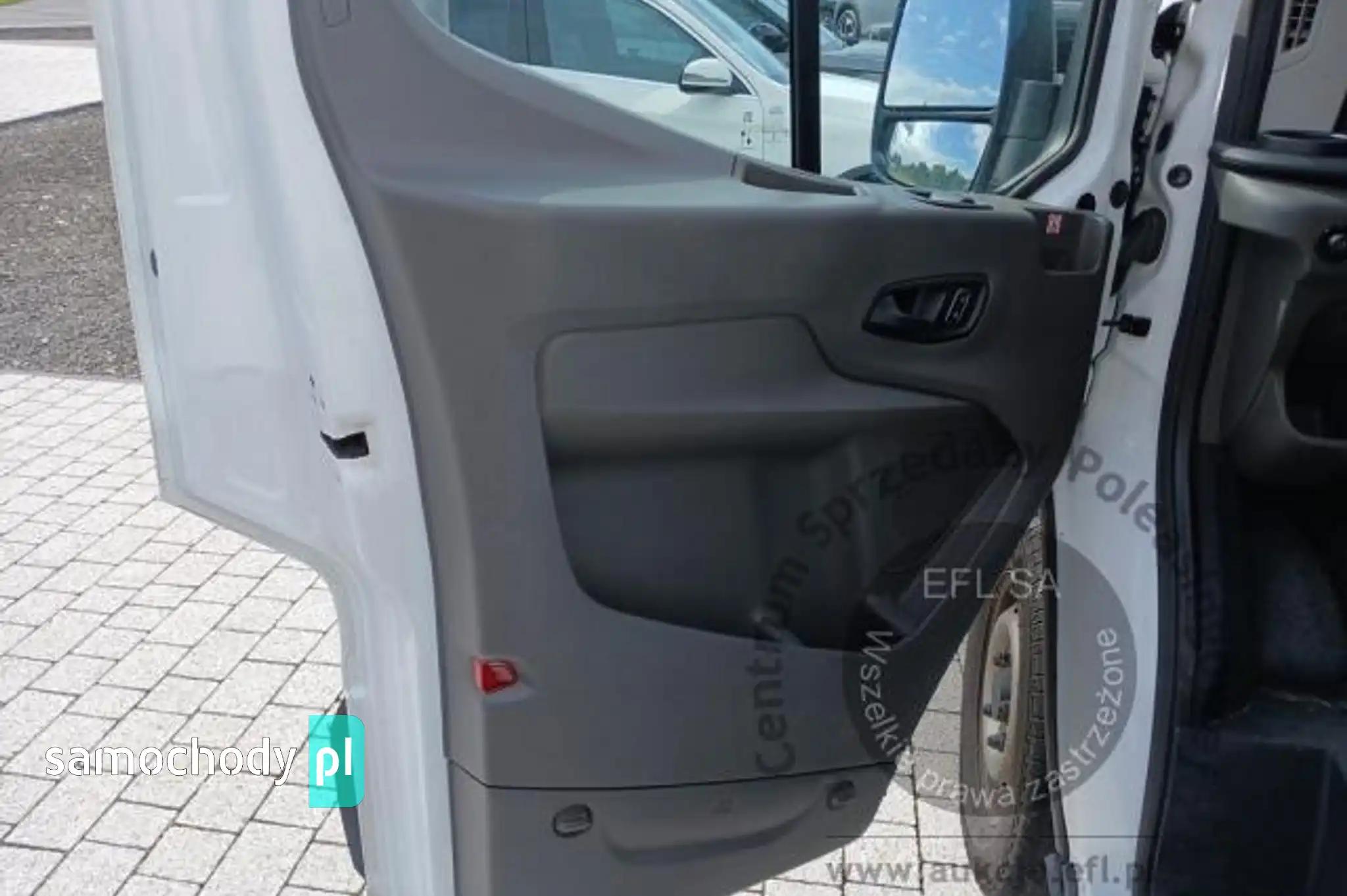 Akumulator standardowyChlapacze z tyłuDach wysokiDrzwi boczne przesuwne, praweESC - elektroniczny układ stabilizacji toru jazdyFelgi stalowe 16 z ogumieniem 235/65Fotel kierowcy regulowany w 4 kierunkachFunkcja ostrzegania o hamowaniu awaryjnym (EBW)Funkcja przypominająca o konieczności zapięcia pasów bezpieczeństwaGniazdo zasilania – 2 x 12VGwarancja na pojazd - 2 lataHamulce – tarczowe z przodu i z tyłuHamulec mechaniczny, postojowyImmobilizer PATSKierownica StandardowaKlamki drzwi – w kolorze tworzywaKolumna kierownicy – z regulacją w dwóch płaszczyznachKołpaki kół - pokrywki piastKomputer pokładowyKonsola podsufitowaKrata wlotu powietrza przednia – w kolorze tworzywaLakier zwykłyListwy boczne szerokie - w kolorze tworzywaLusterka boczne z soczewkami eliminującymi martwe pole widzenia i wbudowanymi kierunkowskazamiModem FordPass ConnectNagrzewnica – recyrkulacjaOświetlenie przedziału ładunkowegoOświetlenie w kabinie – lampki w podsufitce, z funkcją stopniowego wygaszaniaOtwieranie pokrywy silnika kluczykiemPasy bezpieczeństwa – 3-punktowe bezwładnościowe (wszystkie siedzenia)Podłokietnik kierowcyPodsufitka – w kabinie - formowanaPoduszka powietrzna - kierowcyPrzegroda polimerowa, bez oknaPrzestrzeń ładunkowa – zaczepy do mocowania ładunku zgodne z normą DIN 75410Przystosowanie do rozruchu w -20CRadio cyfrowe (DAB) w standardzie 1DINReflektory – regulacja ustawieniaReflektory – światła do jazdy dziennejReflektory halogenoweSchowek pod fotelem pasażeraSchowek podręczny z drzwiczkami, mieszczący teczki formatu A4Schowki w przednich drzwiachSkrzynia biegów -manualna, 6-biegowaStolik rozkładany z fotela pasażeraSystem Auto Start StopSystem kontroli obciążenia pojazdu (LAC)System kontroli ryzyka wywróceniu pojazdu (RSC)System wlewu paliwa Ford Easy FuelSzyby – elektrycznie sterowane szyby przednich drzwi z funkcją otwierania szyby po stronie kierowcyŚwiatła obrysowe boczneTapicerka materiałowaTylne drzwi dwuskrzydlowe; kat otwarcia 270°Uchwyt na telefon/tabletUchwyt pomocniczny - na słupku BUchwyty (2) na kubki w desce rozdzielczejUkład foteli przednich 1+2Układ hamulcowy dwuobwodowy, wspomaganie z samoczynną regulacją i układem ABSUkład poprawiający stabilność na zakrętach (CC)Układ ułatwiający ruszanie pod górę (HSA)Układ wspomagania awaryjnego hamowania (EBA)Układ wspomagania kierownicy elektryczny (EPAS)Wskaźnik zmiany bieguWybór trybu jazdyWycieraczki przednie – zmienna częstotliwość pracy, spryskiwacz elektrycznyWykładzina podłogi w kabinie, gumowa, łatwa w czyszczeniuZamek centralnyZamki drzwi – akustyczna sygnalizacja niedomkniętych drzwi przy zdalnym zaryglowywaniuZamki drzwi – konfiguracja zamykania nr 1, 2-stopniowe odryglowywanieZamki drzwi – samoczynne ryglowanie po ruszeniu z miejscaZamki drzwi – zdalne sterowanie centralnego zamka z 1 pilotemZawieszenie przednieZawieszenie tylne - resory pióroweZbiornik AdBlue – 24 litryZbiornik paliwa 70 litrówZderzak przedni - górna część w kolorze nadwozia, dolna część w kolorze tworzynaZderzak tylny – w kolorze tworzywa, ze zintegrowanym stopniemKlimatyzacja manualnaKoło zapasowe - pełnowymiarowe z zestawem narzędziLusterka boczne elektrycznie regulowane i podgrzewanePodłoga przedziału ładunkowego wyłożona winylem