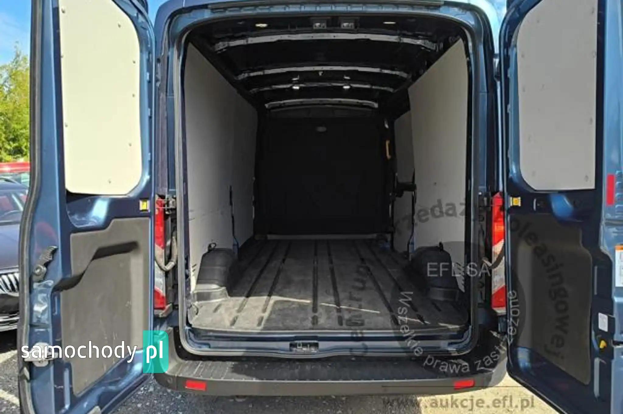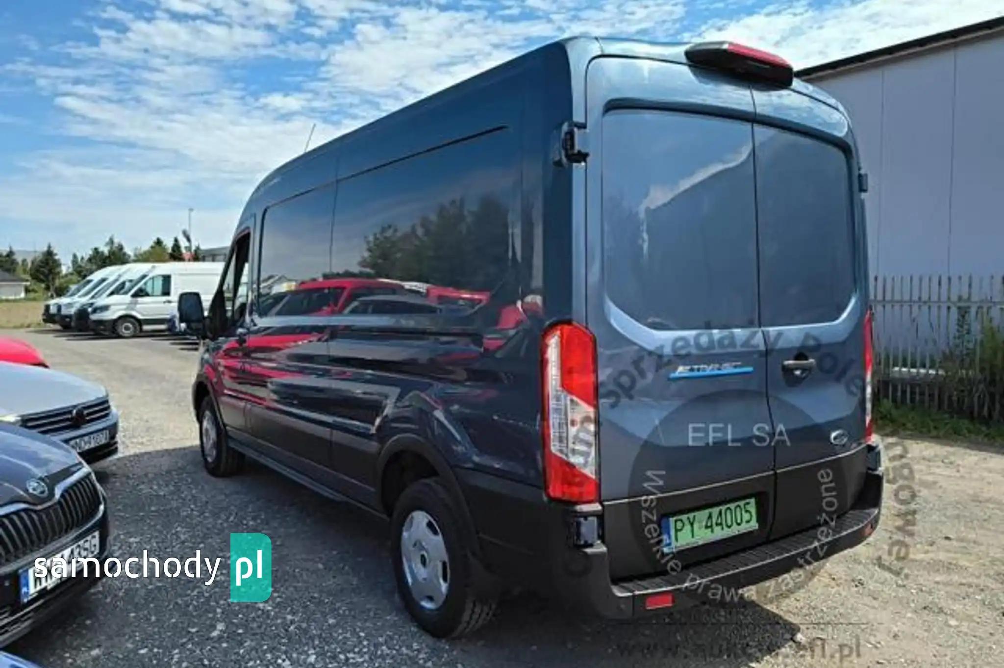 Akumulator standardowyChlapacze z tyłuCollision Mitigation System - system zapobiegania kolizjom z funkcją automatycznego hamowaniaCzujniki parkowania - przednie i tylneDach średniDrzwi boczne przesuwne, praweDrzwi tylne dwuskrzydłowe, kąt otwarcia ok. 180° z ogranicznikiem przy 90°ESC - elektroniczny układ stabilizacji toru jazdyFelgi stalowe 16 z ogumieniem 235/65Fotel kierowcy regulowany w 4 kierunkachFotel pasażera - regulacja odcinka lędźwiowegoFotele przednie podgrzewaneFunkcja ostrzegania o hamowaniu awaryjnym (EBW)Funkcja przypominająca o konieczności zapięcia pasów bezpieczeństwaGniazdo zasilania – 2 x 12VGwarancja na pojazd - 2 lataHamulce – tarczowe z przodu i z tyłuHamulec elektryczny, postojowyImmobilizer PATSKabel do ładownia ze złączem trójfazowym - długość 8mKierownica PremiumKlamki drzwi – w kolorze tworzywaKlimatyzacja automatyczna EATC z systemem nawigacji satelitarnej z systemem multimedialnym SYNC4,Kolumna kierownicy – z regulacją w dwóch płaszczyznachKołpaki kół pełneKomputer pokładowyKonsola podsufitowaKrata wlotu powietrza przednia – w kolorze tworzywa z niebieskimi listwami,Listwy boczne szerokie - w kolorze tworzywaLKA - Lane Keeping Aid - system kontroli pasa ruchuLKW - Lane Keeping Warning - system ostrzegania przed niezamierzonym zjechaniem z pasa ruchuLusterka boczne elektrycznie regulowane i podgrzewaneLusterka boczne z soczewkami eliminującymi martwe pole widzenia i wbudowanymi kierunkowskazamiModem FordPass ConnectNagrzewnica – recyrkulacjaOgranicznik prędkości - 90 km/hOświetlenie przedziału ładunkowegoOświetlenie w kabinie – lampki w podsufitce, z funkcją stopniowego wygaszania oraz do czytania mapOtwieranie pokrywy silnika kluczykiemPasy bezpieczeństwa – 3-punktowe bezwładnościowe (wszystkie siedzenia)Podłoga przedziału ładunkowego wyłożona winylemPodłokietnik kierowcyPodsufitka – w kabinie - formowanaPoduszka powietrzna - kierowcyPrzegroda polimerowa, bez oknaPrzekładnia głównaPrzestrzeń ładunkowa – zaczepy do mocowania ładunku zgodne z normą DIN 75410Przycisk rozrusznika FordPowerReflektory – automatyczne włączanie/wyłączanieReflektory – regulacja ustawieniaReflektory – światła do jazdy dziennejReflektory halogenoweSchowek pod fotelem pasażeraSchowek podręczny z drzwiczkami, zamykany na zamek, mieszczący teczki formatu A4Schowki w przednich drzwiachStolik rozkładany z fotela pasażeraSystem kontroli obciążenia pojazdu (LAC)System kontroli ryzyka wywróceniu pojazdu (RSC)Szyba przednia podgrzewana QuickclearSzyby – elektrycznie sterowane szyby przednich drzwi z funkcją otwierania szyby po stronie kierowcyŚwiatła przednie przeciwmgielneTapicerka materiałowaTempomatUchwyt pomocniczny - na słupku BUchwyty (2) na kubki w desce rozdzielczejUkład foteli przednich 1+2Układ hamulcowy dwuobwodowy, wspomaganie z samoczynną regulacją i układem ABSUkład poprawiający stabilność na zakrętach (CC)Układ ułatwiający ruszanie pod górę (HSA)Układ wspomagania awaryjnego hamowania (EBA)Układ wspomagania kierownicy elektryczny (EPAS)Wybór trybu jazdyWycieraczki przednie - automatyczne z czujnikiem deszczuWycieraczki przednie – zmienna częstotliwość pracy, spryskiwacz elektrycznyWykładzina podłogi w kabinie, gumowa, łatwa w czyszczeniuZamek centralnyZamki drzwi – akustyczna sygnalizacja niedomkniętych drzwi przy zdalnym zaryglowywaniuZamki drzwi – konfiguracja zamykania nr 1, 2-stopniowe odryglowywanieZamki drzwi – samoczynne ryglowanie po ruszeniu z miejscaZawieszenie przednieZawieszenie tylne - wielowahaczoweZderzak przedni - górna część w kolorze nadwozia, dolna część w kolorze tworzynaZderzak tylny – w kolorze tworzywa, ze zintegrowanym stopniemKoło zapasowe - pełnowymiarowe z zestawem narzędziLakier metalik