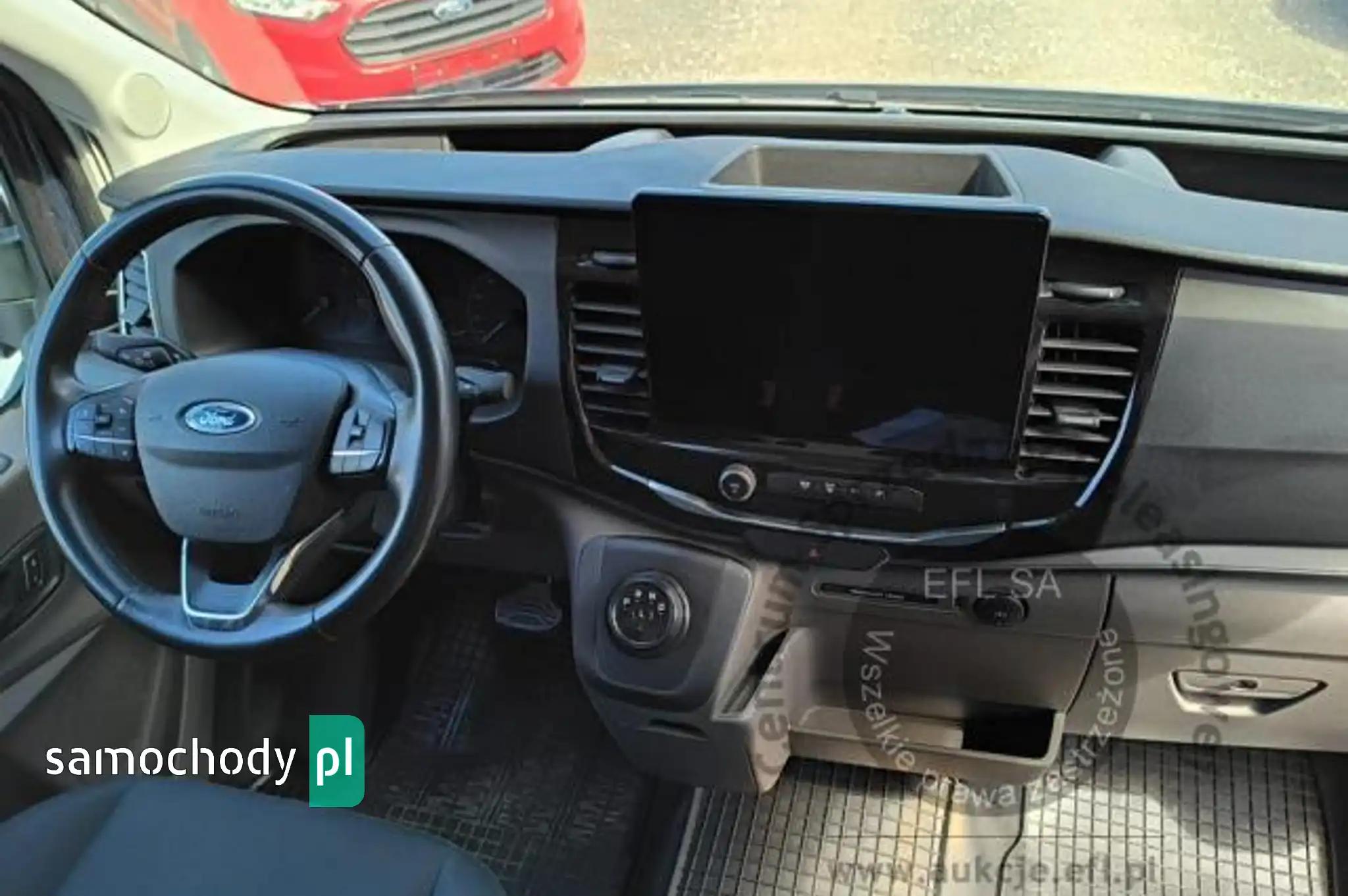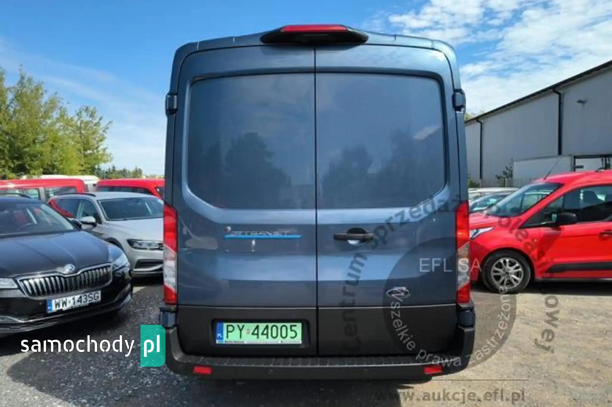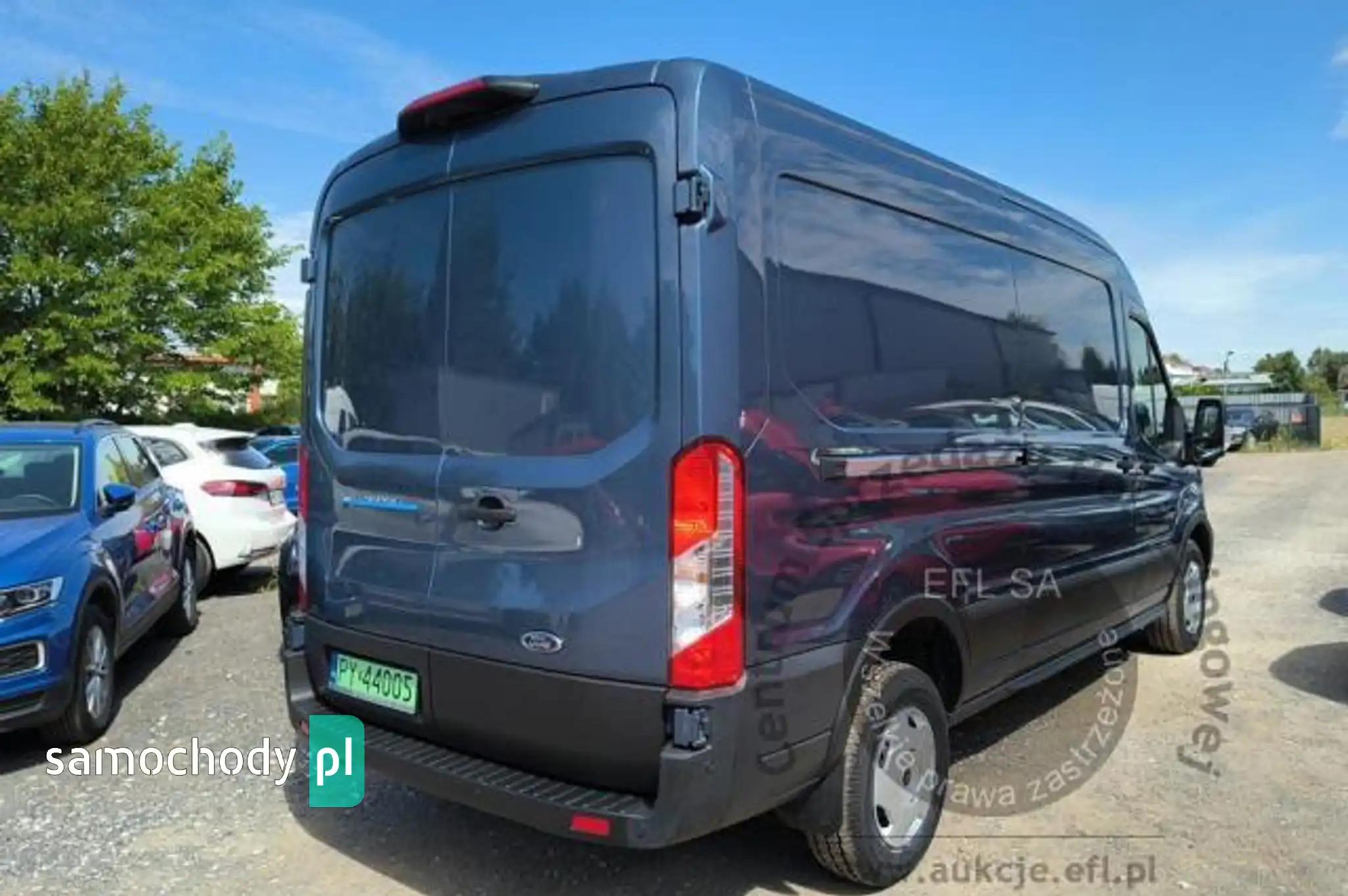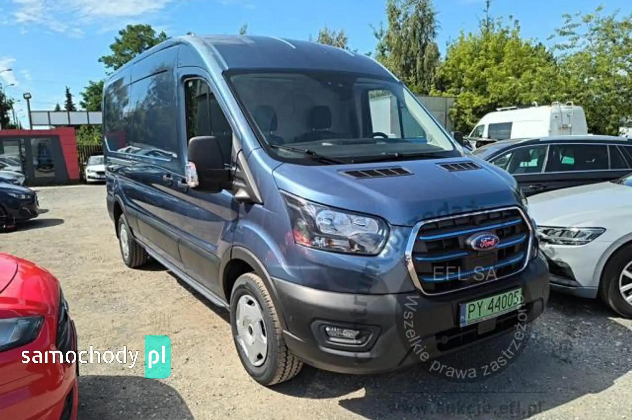 Akumulator standardowyChlapacze z tyłuCollision Mitigation System - system zapobiegania kolizjom z funkcją automatycznego hamowaniaCzujniki parkowania - przednie i tylneDach średniDrzwi boczne przesuwne, praweDrzwi tylne dwuskrzydłowe, kąt otwarcia ok. 180° z ogranicznikiem przy 90°ESC - elektroniczny układ stabilizacji toru jazdyFelgi stalowe 16 z ogumieniem 235/65Fotel kierowcy regulowany w 4 kierunkachFotel pasażera - regulacja odcinka lędźwiowegoFotele przednie podgrzewaneFunkcja ostrzegania o hamowaniu awaryjnym (EBW)Funkcja przypominająca o konieczności zapięcia pasów bezpieczeństwaGniazdo zasilania – 2 x 12VGwarancja na pojazd - 2 lataHamulce – tarczowe z przodu i z tyłuHamulec elektryczny, postojowyImmobilizer PATSKabel do ładownia ze złączem trójfazowym - długość 8mKierownica PremiumKlamki drzwi – w kolorze tworzywaKlimatyzacja automatyczna EATC z systemem nawigacji satelitarnej z systemem multimedialnym SYNC4,Kolumna kierownicy – z regulacją w dwóch płaszczyznachKołpaki kół pełneKomputer pokładowyKonsola podsufitowaKrata wlotu powietrza przednia – w kolorze tworzywa z niebieskimi listwami,Listwy boczne szerokie - w kolorze tworzywaLKA - Lane Keeping Aid - system kontroli pasa ruchuLKW - Lane Keeping Warning - system ostrzegania przed niezamierzonym zjechaniem z pasa ruchuLusterka boczne elektrycznie regulowane i podgrzewaneLusterka boczne z soczewkami eliminującymi martwe pole widzenia i wbudowanymi kierunkowskazamiModem FordPass ConnectNagrzewnica – recyrkulacjaOgranicznik prędkości - 90 km/hOświetlenie przedziału ładunkowegoOświetlenie w kabinie – lampki w podsufitce, z funkcją stopniowego wygaszania oraz do czytania mapOtwieranie pokrywy silnika kluczykiemPasy bezpieczeństwa – 3-punktowe bezwładnościowe (wszystkie siedzenia)Podłoga przedziału ładunkowego wyłożona winylemPodłokietnik kierowcyPodsufitka – w kabinie - formowanaPoduszka powietrzna - kierowcyPrzegroda polimerowa, bez oknaPrzekładnia głównaPrzestrzeń ładunkowa – zaczepy do mocowania ładunku zgodne z normą DIN 75410Przycisk rozrusznika FordPowerReflektory – automatyczne włączanie/wyłączanieReflektory – regulacja ustawieniaReflektory – światła do jazdy dziennejReflektory halogenoweSchowek pod fotelem pasażeraSchowek podręczny z drzwiczkami, zamykany na zamek, mieszczący teczki formatu A4Schowki w przednich drzwiachStolik rozkładany z fotela pasażeraSystem kontroli obciążenia pojazdu (LAC)System kontroli ryzyka wywróceniu pojazdu (RSC)Szyba przednia podgrzewana QuickclearSzyby – elektrycznie sterowane szyby przednich drzwi z funkcją otwierania szyby po stronie kierowcyŚwiatła przednie przeciwmgielneTapicerka materiałowaTempomatUchwyt pomocniczny - na słupku BUchwyty (2) na kubki w desce rozdzielczejUkład foteli przednich 1+2Układ hamulcowy dwuobwodowy, wspomaganie z samoczynną regulacją i układem ABSUkład poprawiający stabilność na zakrętach (CC)Układ ułatwiający ruszanie pod górę (HSA)Układ wspomagania awaryjnego hamowania (EBA)Układ wspomagania kierownicy elektryczny (EPAS)Wybór trybu jazdyWycieraczki przednie - automatyczne z czujnikiem deszczuWycieraczki przednie – zmienna częstotliwość pracy, spryskiwacz elektrycznyWykładzina podłogi w kabinie, gumowa, łatwa w czyszczeniuZamek centralnyZamki drzwi – akustyczna sygnalizacja niedomkniętych drzwi przy zdalnym zaryglowywaniuZamki drzwi – konfiguracja zamykania nr 1, 2-stopniowe odryglowywanieZamki drzwi – samoczynne ryglowanie po ruszeniu z miejscaZawieszenie przednieZawieszenie tylne - wielowahaczoweZderzak przedni - górna część w kolorze nadwozia, dolna część w kolorze tworzynaZderzak tylny – w kolorze tworzywa, ze zintegrowanym stopniemKoło zapasowe - pełnowymiarowe z zestawem narzędziLakier metalik