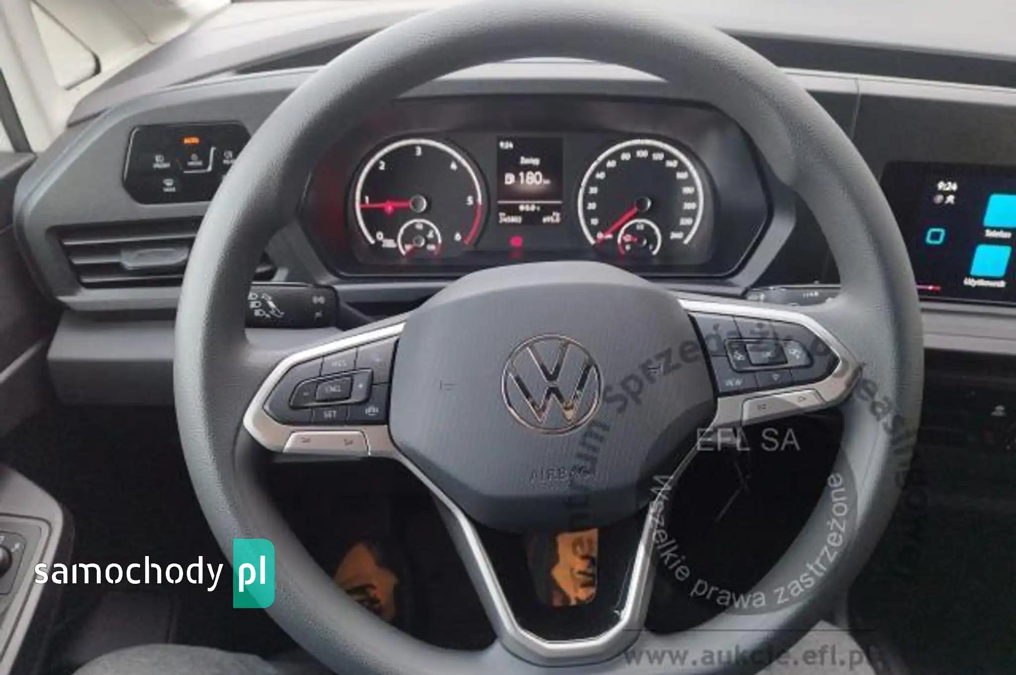 Brak lusterka wstecznegoDrzwi boczne przesuwne po prawej stronie przestrzeni pasażerskiej-ładunkowejDrzwi tylne dwuskrzydłowe asymetryczne, bez okienElementy dekoracyjne na desce rozdzielczej, Bright Brushed GrayESP (elektroniczny system stabilizacji toru jazdy z ABS, EDS, ASR, MSR i asystentem siły hamowania)Felgi stalowe 15 czarne 6.5J x 15Fotel kierowcy z regulacją wysokościImmobiliserInstalacja telefoniczna BluetoothKierownica multifunkcyjnaKlimatyzacja półautomatyczna ClimaticKluczyki składane dwaKoło zapasowe pełnowymiarowe z obręczą stalowąKołpaki kół pełneKonsola środkowa z 2 uchwytami na napojeLakier uniLusterka zewnętrzne elektrycznie regulowane i ogrzewaneObudowy lusterek i klamki czarne, srebrna prowadnica drzwi przesuwnychOpony 205/65 R15 99H XL o zmniejszonym oporze toczeniaOsłony przeciwsłoneczne bez lusterekOświetlenie przestrzeni pasażerskiej-ładunkowej, 1 lampkaPasy bezpieczeństwa 3-punktowe, przódPodłoga w kabinie kierowcy wyłożona wykładziną dywanowąPoduszki powietrzne dla pasażera z możliwością dezaktywacjiPrzygotowanie pod montaż relingówReflektory halogenowe przednie, podwójneReflektory sterowane automatycznie z oddzielnymi światłami do jazdy dziennejRegulacja zasięgu reflektorówSchowek w desce rozdzielczej, po prawej stronieSygnalizacja niezapiętych pasów bezpieczeństwa kierowcy i pasażeraSystem powiadamiania ratunkowego eCallSystem start-stop, system rekuperacji odzyskujący energię podczas hamowaniaSystem wykrywania zmęczenia kierowcy, Driver AlertSzyba przednia termoizolacyjnaSzyby termoizolacyjne (zielone)Ściana działowa bez oknaTapicerka materiałowa, podwójna krataVolkswagen Safe+ 36 miesięcy gwarancji; pierwsze 2 lata bez limitu km, trzeci rok z maks. 90,000 kmWspomaganie układu kierowniczego zależne od prędkości (servotronic)Wycieraczki przedniej szyby z regulacją prędkościWyłożenie drzwi wraz z podłokietnikiem z tworzywaZamek centralny z możliwością uruchamiania od wewnątrz, sterowany pilotemZderzaki nielakierowane (czarne)Alarm antywłamaniowy z własnym zasilaniem, dozorem wnętrza i zabezpieczeniem przed odholowaniemCzujniki parkowania w tylnym zderzakuRadio Composition Colour, kolorowy wyświetlacz 8.25 cala, 2xUSB, 4 głośniki, BluetoothGniazda USB typu C (dwa) w desce rozdzielczejPrzygotowanie do We Connect and We Connect PlusŚwiatła przeciwmgielne z przodu ze statycznym doświetlaniem zakrętów