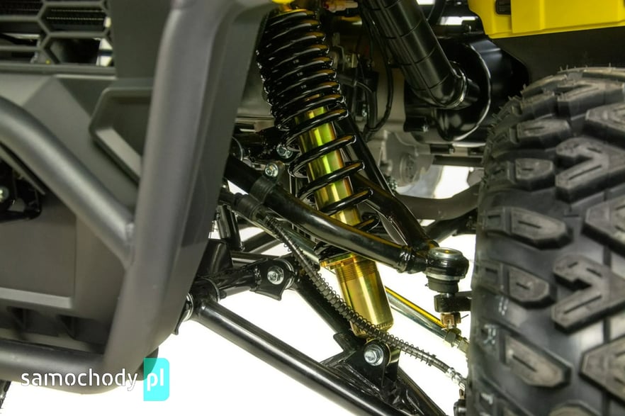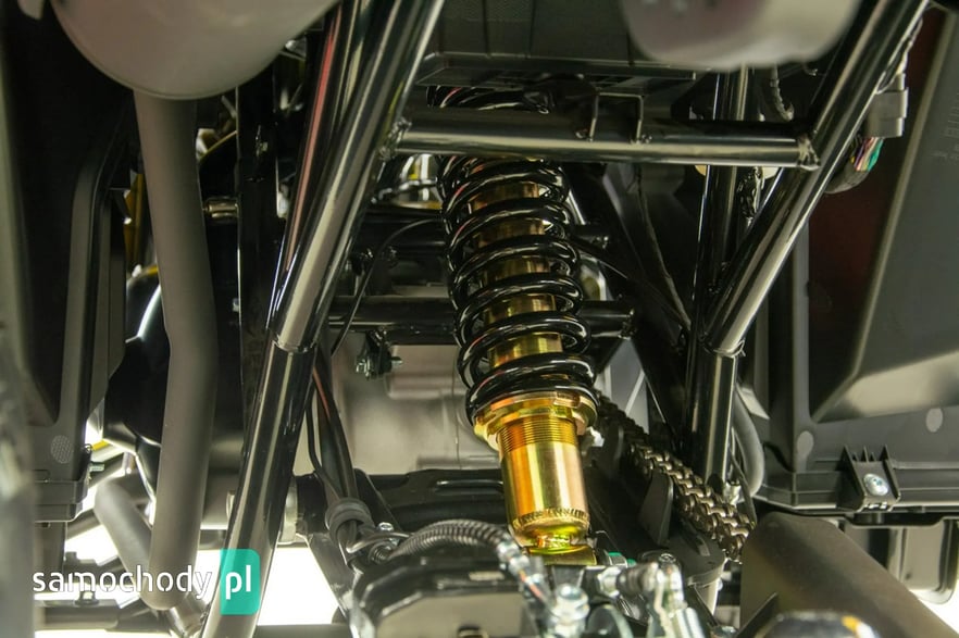 Za bezpieczeństwo odpowiadają hydrauliczne tarczowe hamulce z przodu i z tyłu, które gwarantują skuteczne i przewidywalne hamowanie nawet przy szybszej jeździe. Zawieszenie o dużym skoku świetnie tłumi nierówności i poprawia komfort prowadzenia na trudnym terenie.