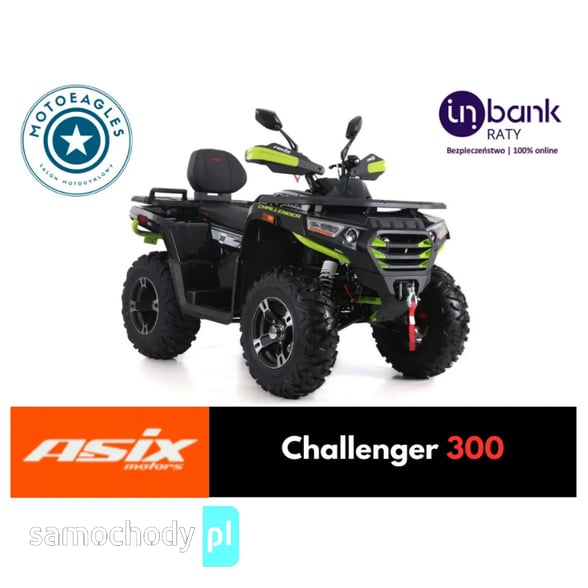 ASIX Challenger 300 T3B to wszechstronny quad użytkowo-terenowy o pojemności 270 cm³, który łączy moc, komfort jazdy terenowej i legalną homologację drogową. Dzięki homologacji T3B pojazd może być bez problemu zarejestrowany i użytkowany na drogach publicznych jako ciągnik rolniczy, a homologacja 2-osobowa pozwala na jazdę z pasażerem.