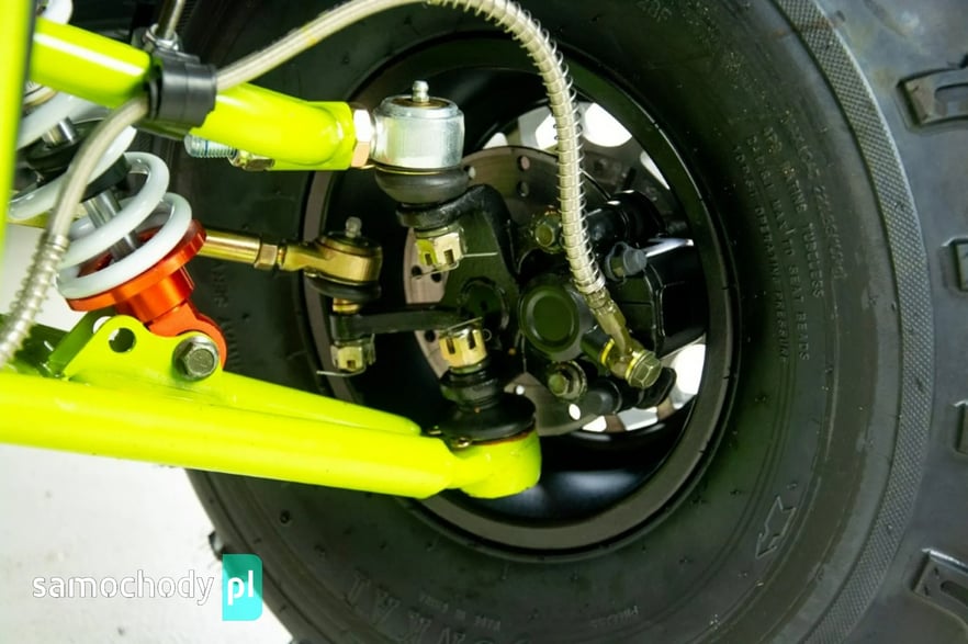 Za bezpieczeństwo odpowiadają hydrauliczne hamulce tarczowe z przodu i tyłu, które gwarantują skuteczne, równomierne hamowanie — to istotny element podczas jazdy w terenie. Zawieszenie o odpowiednim skoku skutecznie tłumi nierówności, poprawiając komfort i kontrolę nad pojazdem.