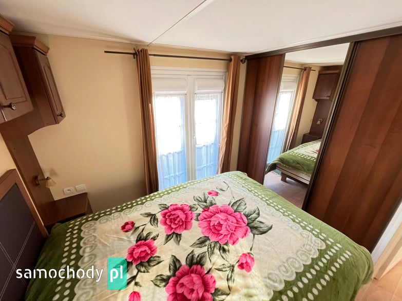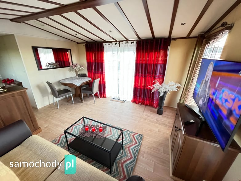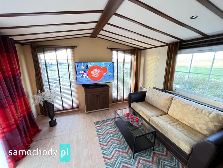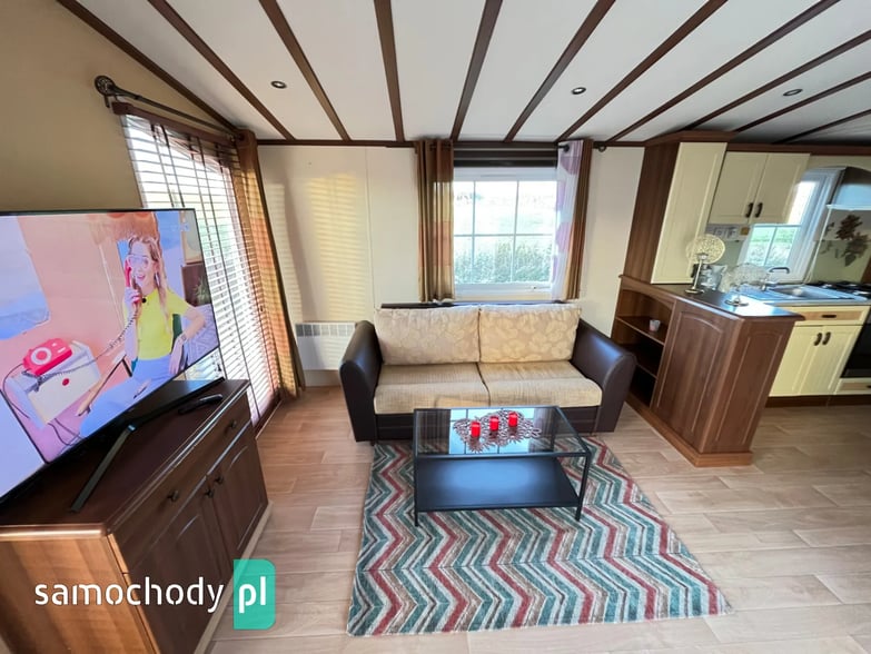 - SALON: Wygodna kanapa z ŁÓŻKIEM POLOWYM w środku, meble do przechowywania, telewizor, stolik, szafka w której jest WEBASTO, rolety w oknach