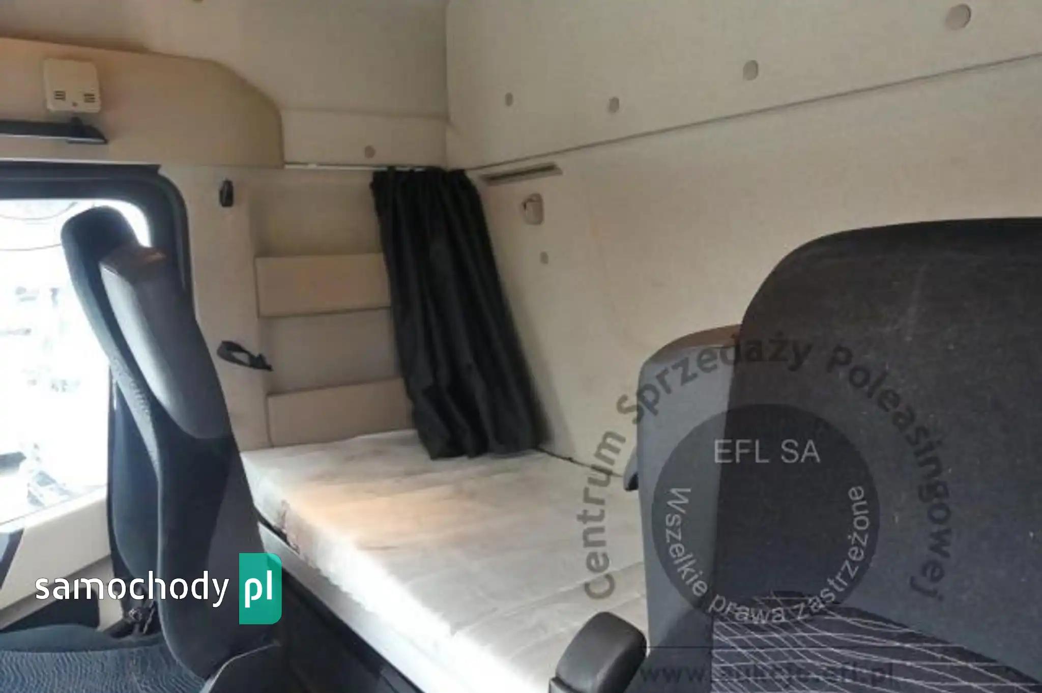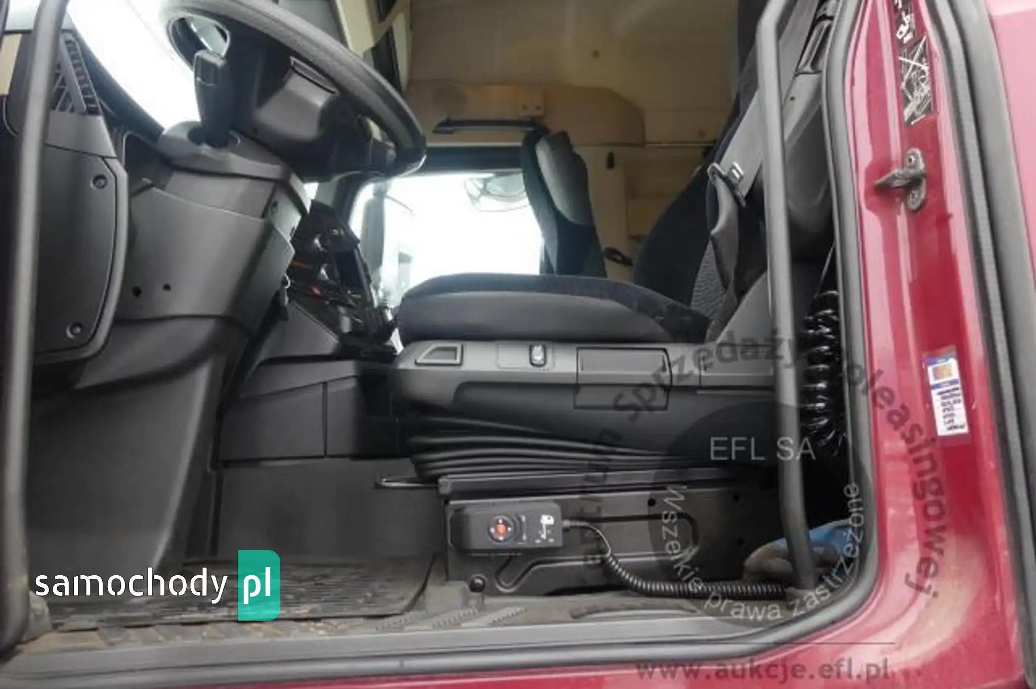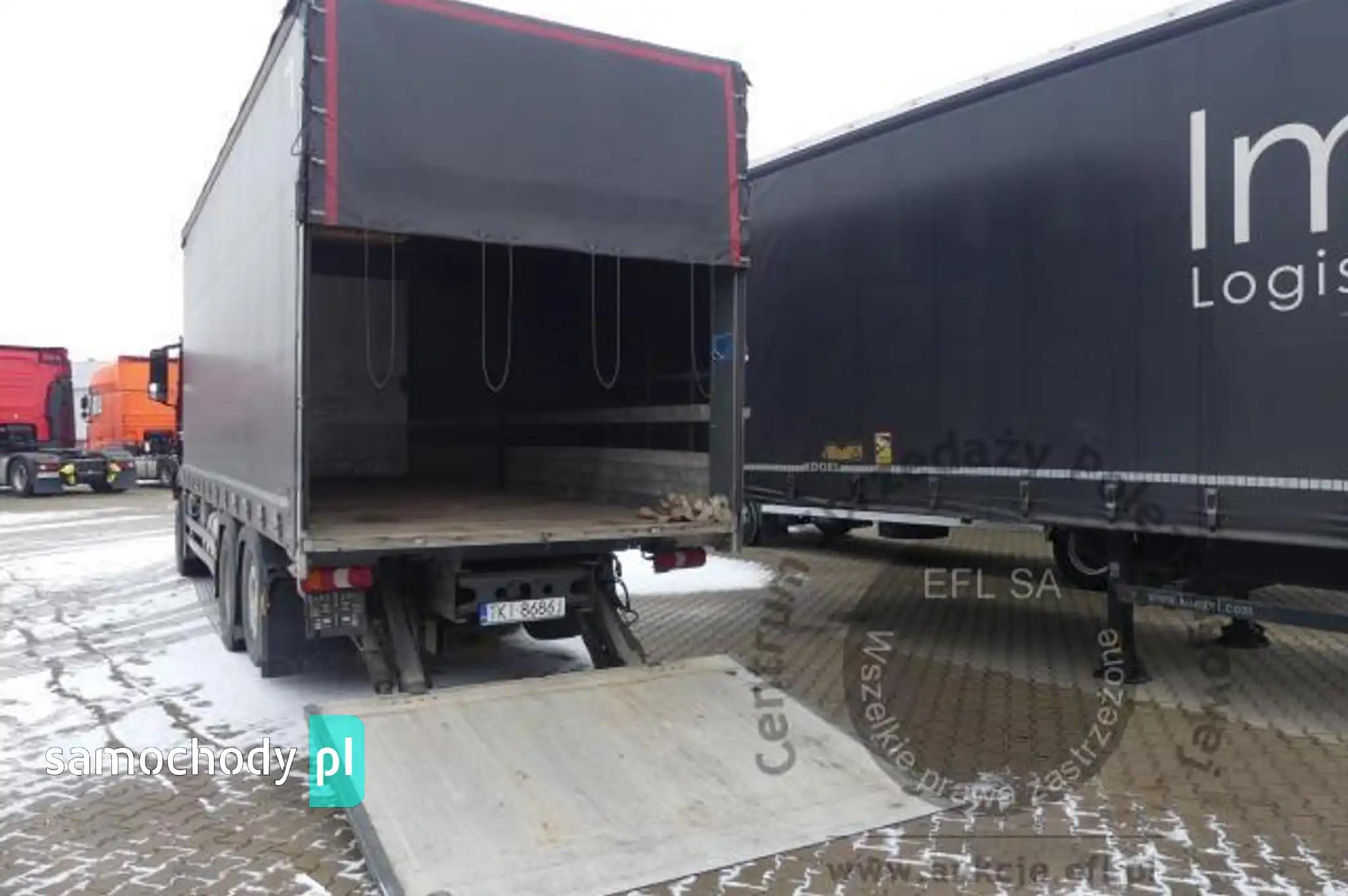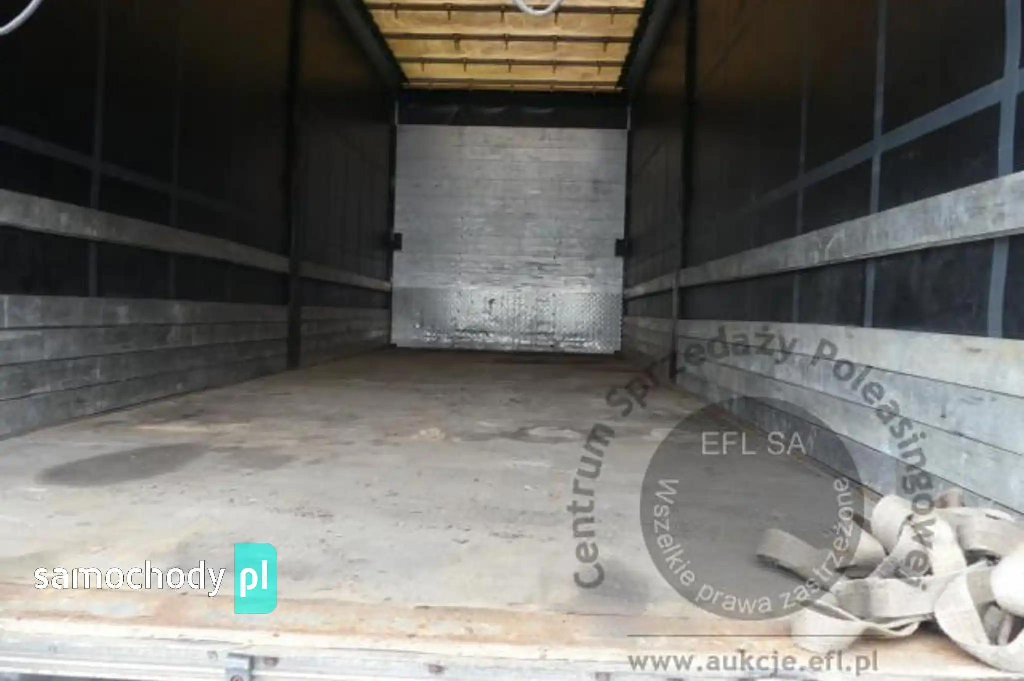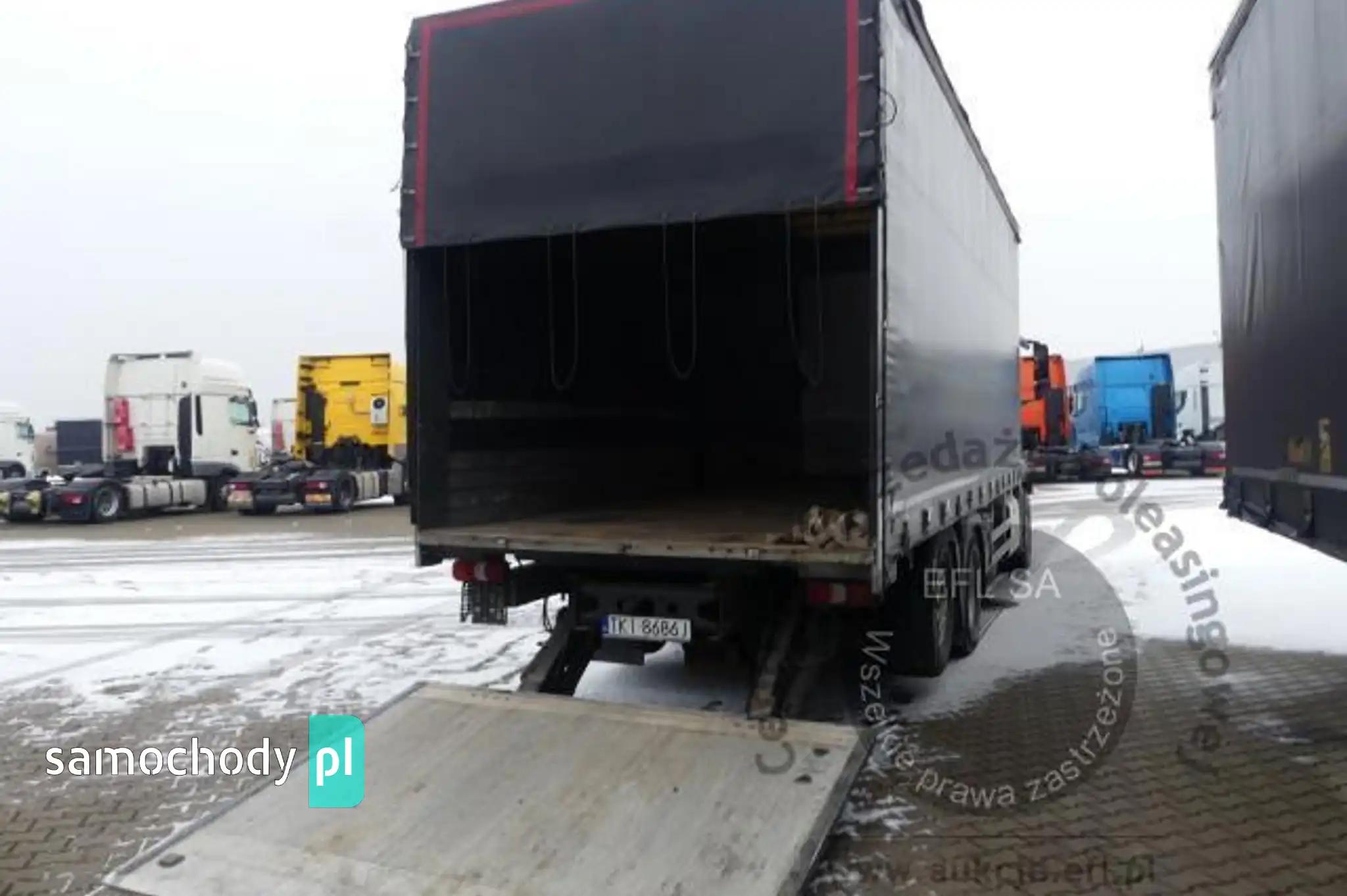 Silnik: Rozładowane akumulatory. Silnik uruchomiono przy pomocy akumulatorów zewnętrznych. Rozruch silnika w warunkach parkingowych w normie. Podczas pracy silnika aktywny jest alert "dolna przesłona chłodnicy nie działa", "przegląd techniczny natychmiast". Stwierdzono wycieki oleju spod uszczelnień silnika. Zaleca się sprawdzenie silnika w warunkach serwisowych i drogowych. Podwozie: Rama - miejscowe ogniska korozji. Zawieszenie osi przedniej oparte na resorach. Zawieszenie osi tylnych oparte na poduszkach pneumatycznych. Powiększone zużycie elementów ciernych układu hamulcowego. Układ kierowniczy – działanie w warunkach parkingowych w normie. Pojazd wyposażony w sprzęg przyczepy. Rozstaw osi I-II ok 4900mm. Nadwozie: Barwa kabiny - bordowa. Zderzak przedni – zarysowania. Szyba czołowa - miejscowe odpryski. Zmatowiałe klosze reflektorów. Pęknięta przednia osłona p/słoneczna. Drzwi prawe - miejscowe zarysowania. Ściana tylna - zarysowania. Ściana boczna lewa - zagięcie punktowe. Drzwi lewe - miejscowe zagięcia i zarysowania. Lewe stopnie wejściowe - zarysowania, pęknięcia. Na poszyciach kabiny stwierdzono miejscowe zarysowania i zagięcia. Zmierzona grubość powłoki metalowych elementów kabiny: do 143um.Zabudowa ładunkowa, stwierdzono: zabudowa skrzyniowa z opończą. Opończa ścian bocznych w formie firan. Dach suwany. Opończa z miejscowymi rozdarciami. Stelaż opończy z zarysowaniami. Wymiary przestrzeni ładunkowej: długość ok 7300mm, szerokość ok 2450mm, wysokość ok 2800mm. Stwierdzono zarysowania i zagięcia poszyć zabudowy. Zastawki ścian bocznych aluminiowe - 20 sztuk. Zabudowa wyposażona w podest ruchomy BAR BC 2000 S4U-W4. Rok produkcji podestu - 2014. Udźwig podestu - 2000kg. Podest opuszczono i uniesiono. Wymiary podestu 2500mm x 1950mm. Stwierdzono księgę rewizyjną UDT. Termin następnego badania UDT - czerwiec 2024. Układ przeniesienia napędu: Skrzynia biegów – automatyczna. Działanie skrzyni biegów sprawdzono w ograniczonym zakresie w warunkach parkingowych. Napęd na oś drugą. Brak śruby pokrywy piasty koła II osi. Obręcze kół - stalowe - 9 sztuk, miejscowo skorodowane. Wnętrze: Deska rozdzielcza i poszycia tapicerskie wnętrza pojazdu – miejscowe zarysowania z ubytkami tworzywa. Układ klimatyzacji wymaga sprawdzenia szczelności, uzupełnienia czynnika roboczego oraz oczyszczenia parownika i układu dolotowego powietrza do wnętrza. Ogrzewanie postojowe uruchamia się. Pojazd wyposażony w jedną leżankę. Niefabryczny materac. Wyposażenie: Amortyzowany i ogrzewany fotel kierowcy.Podnoszona 3 oś.Szyby drzwi sterowane elektrycznie.Elektrycznie sterowany luk dachowy.Radioodtwarzacz fabryczny. Wyposażenie dodatkowe: ABS, Automatyczna skrzynia biegów, Blokada tylnego mechanizmu różnicowego, ESP (układ stabilizacji toru jazdy), Immobilizer, Kierownica wielofunkcyjna, Kierownica skórzana, Klimatyzacja, Lusterka boczne sterowane elektrycznie, Ogrzewanie postojowe, Światła przeciwmgielne, Tempomat, Wspomaganie układu kierowniczego, Zamek centralny (zdalnie sterowany), Tachograf, Hamulec silnikowy Ogumienie: Oś I lewa - prod: Matador FHR4 rozm: 385/55R22,5 zuż: 30%Oś I prawa - prod: Matador FHR4 rozm: 385/55R22,5 zuż: 30%Oś II lewa zew - prod: Berliner rozm: 315/70R22,5 zuż: 50%Oś II lewa wew - prod: Berliner rozm: 315/70R22,5 zuż: 50%Oś II prawa zew - prod: Berliner rozm: 315/70R22,5 zuż: 50%Oś II prawa wew - prod: Berliner rozm: 315/70R22,5 zuż: 50%Oś III lewa - prod: Semperit rozm: 385/55R22,5 zuż: 90%Oś III prawa - prod: Semperit rozm: 385/55R22,5 zuż: 70%Zapas - prod: Pirelli rozm: 315/70R22,5 zuż: 70% Uwagi: 1. Termin badania technicznego: 11.10.2025.2. Brak książki serwisowej.