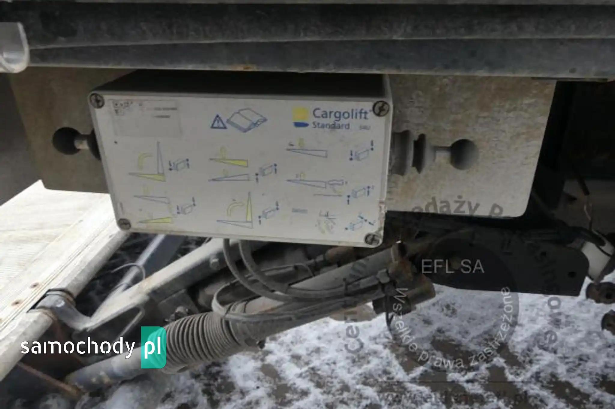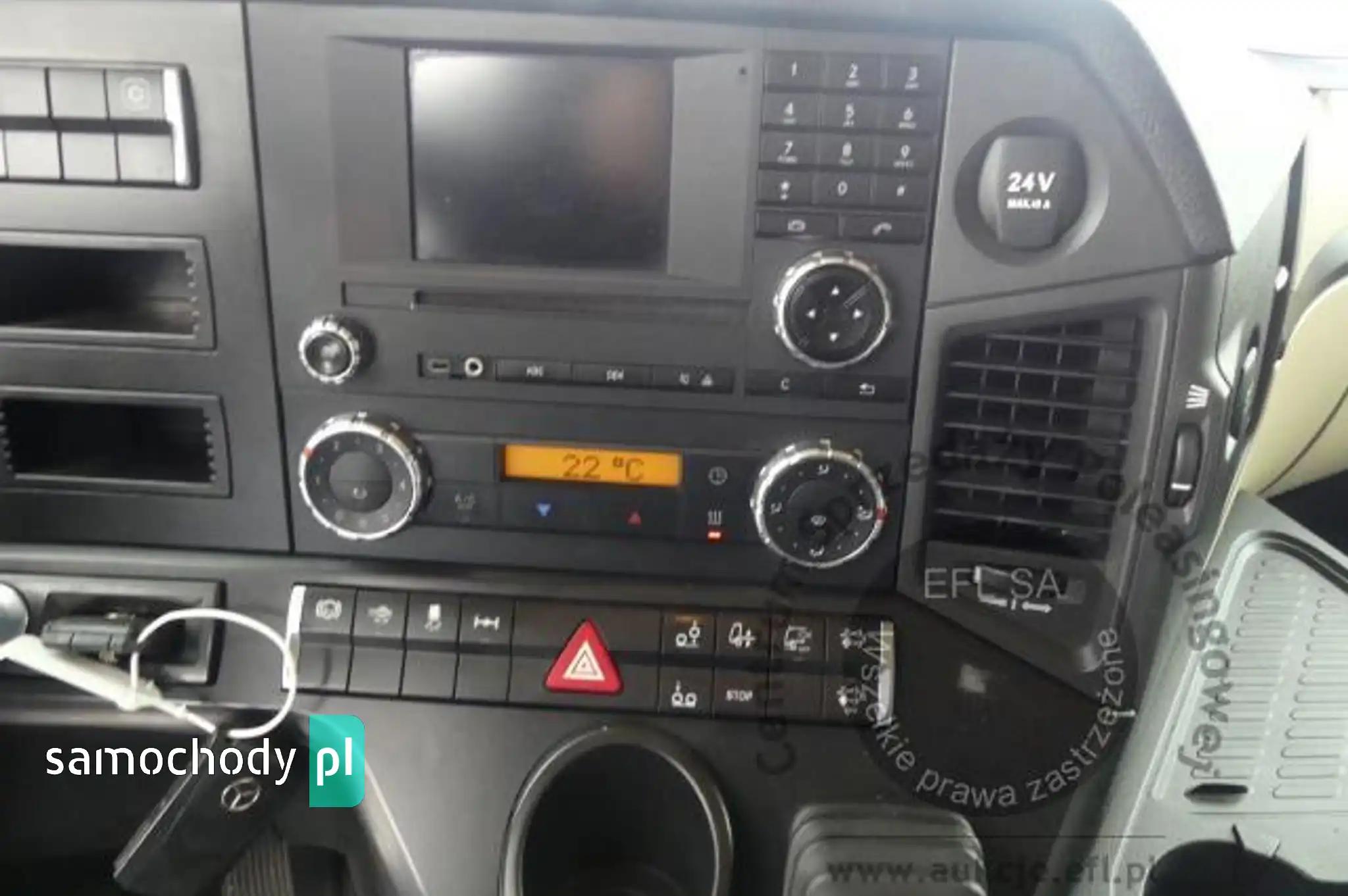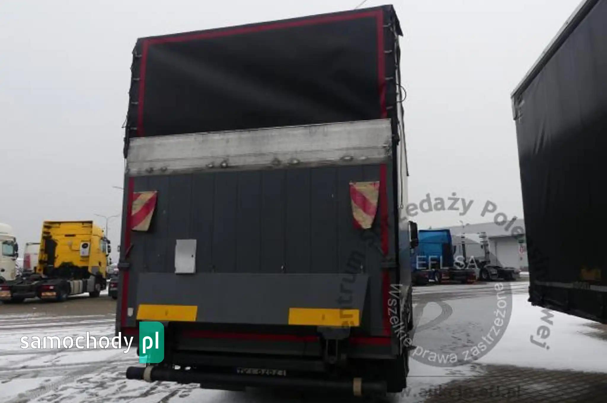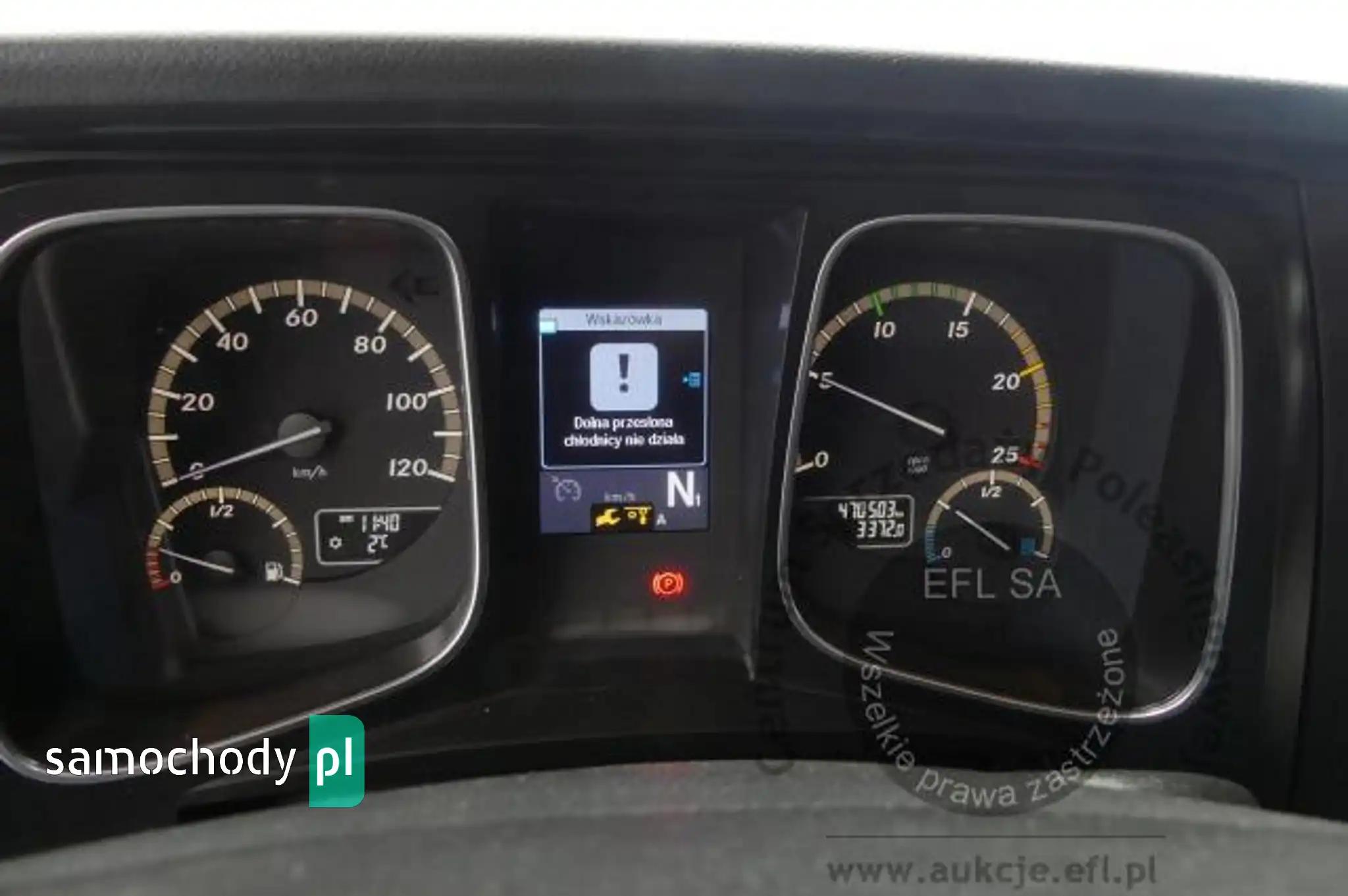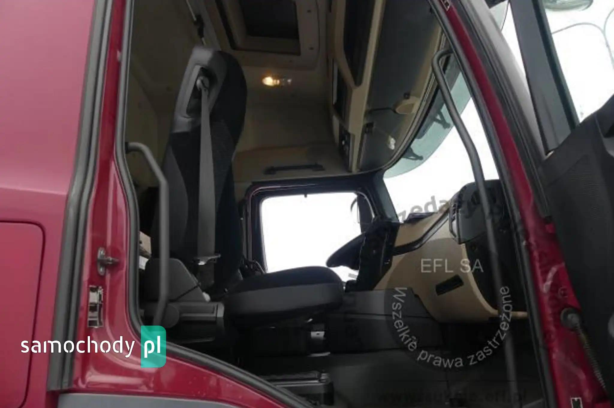 Silnik: Rozładowane akumulatory. Silnik uruchomiono przy pomocy akumulatorów zewnętrznych. Rozruch silnika w warunkach parkingowych w normie. Podczas pracy silnika aktywny jest alert "dolna przesłona chłodnicy nie działa", "przegląd techniczny natychmiast". Stwierdzono wycieki oleju spod uszczelnień silnika. Zaleca się sprawdzenie silnika w warunkach serwisowych i drogowych. Podwozie: Rama - miejscowe ogniska korozji. Zawieszenie osi przedniej oparte na resorach. Zawieszenie osi tylnych oparte na poduszkach pneumatycznych. Powiększone zużycie elementów ciernych układu hamulcowego. Układ kierowniczy – działanie w warunkach parkingowych w normie. Pojazd wyposażony w sprzęg przyczepy. Rozstaw osi I-II ok 4900mm. Nadwozie: Barwa kabiny - bordowa. Zderzak przedni – zarysowania. Szyba czołowa - miejscowe odpryski. Zmatowiałe klosze reflektorów. Pęknięta przednia osłona p/słoneczna. Drzwi prawe - miejscowe zarysowania. Ściana tylna - zarysowania. Ściana boczna lewa - zagięcie punktowe. Drzwi lewe - miejscowe zagięcia i zarysowania. Lewe stopnie wejściowe - zarysowania, pęknięcia. Na poszyciach kabiny stwierdzono miejscowe zarysowania i zagięcia. Zmierzona grubość powłoki metalowych elementów kabiny: do 143um.Zabudowa ładunkowa, stwierdzono: zabudowa skrzyniowa z opończą. Opończa ścian bocznych w formie firan. Dach suwany. Opończa z miejscowymi rozdarciami. Stelaż opończy z zarysowaniami. Wymiary przestrzeni ładunkowej: długość ok 7300mm, szerokość ok 2450mm, wysokość ok 2800mm. Stwierdzono zarysowania i zagięcia poszyć zabudowy. Zastawki ścian bocznych aluminiowe - 20 sztuk. Zabudowa wyposażona w podest ruchomy BAR BC 2000 S4U-W4. Rok produkcji podestu - 2014. Udźwig podestu - 2000kg. Podest opuszczono i uniesiono. Wymiary podestu 2500mm x 1950mm. Stwierdzono księgę rewizyjną UDT. Termin następnego badania UDT - czerwiec 2024. Układ przeniesienia napędu: Skrzynia biegów – automatyczna. Działanie skrzyni biegów sprawdzono w ograniczonym zakresie w warunkach parkingowych. Napęd na oś drugą. Brak śruby pokrywy piasty koła II osi. Obręcze kół - stalowe - 9 sztuk, miejscowo skorodowane. Wnętrze: Deska rozdzielcza i poszycia tapicerskie wnętrza pojazdu – miejscowe zarysowania z ubytkami tworzywa. Układ klimatyzacji wymaga sprawdzenia szczelności, uzupełnienia czynnika roboczego oraz oczyszczenia parownika i układu dolotowego powietrza do wnętrza. Ogrzewanie postojowe uruchamia się. Pojazd wyposażony w jedną leżankę. Niefabryczny materac. Wyposażenie: Amortyzowany i ogrzewany fotel kierowcy.Podnoszona 3 oś.Szyby drzwi sterowane elektrycznie.Elektrycznie sterowany luk dachowy.Radioodtwarzacz fabryczny. Wyposażenie dodatkowe: ABS, Automatyczna skrzynia biegów, Blokada tylnego mechanizmu różnicowego, ESP (układ stabilizacji toru jazdy), Immobilizer, Kierownica wielofunkcyjna, Kierownica skórzana, Klimatyzacja, Lusterka boczne sterowane elektrycznie, Ogrzewanie postojowe, Światła przeciwmgielne, Tempomat, Wspomaganie układu kierowniczego, Zamek centralny (zdalnie sterowany), Tachograf, Hamulec silnikowy Ogumienie: Oś I lewa - prod: Matador FHR4 rozm: 385/55R22,5 zuż: 30%Oś I prawa - prod: Matador FHR4 rozm: 385/55R22,5 zuż: 30%Oś II lewa zew - prod: Berliner rozm: 315/70R22,5 zuż: 50%Oś II lewa wew - prod: Berliner rozm: 315/70R22,5 zuż: 50%Oś II prawa zew - prod: Berliner rozm: 315/70R22,5 zuż: 50%Oś II prawa wew - prod: Berliner rozm: 315/70R22,5 zuż: 50%Oś III lewa - prod: Semperit rozm: 385/55R22,5 zuż: 90%Oś III prawa - prod: Semperit rozm: 385/55R22,5 zuż: 70%Zapas - prod: Pirelli rozm: 315/70R22,5 zuż: 70% Uwagi: 1. Termin badania technicznego: 11.10.2025.2. Brak książki serwisowej.
