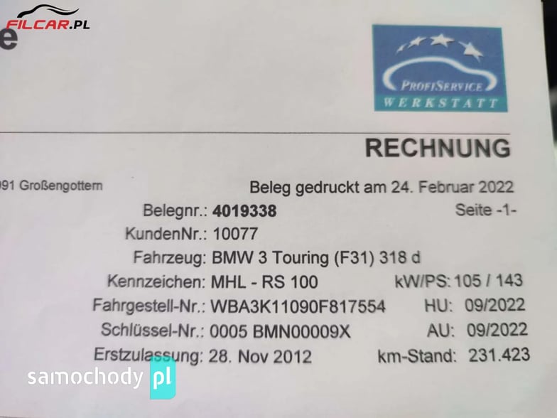 Zarejestrowane w Polsce BMW serii 3 (F30/F31) w wersji sport line, wyprodukowane w 2012 roku z dynamicznym i bezawaryjnym dwulitrowym silnikiem diesla o mocy 143 koni mechanicznych. Oryginalny przebieg 305 tysięcy kilometrów potwierdzony bazą danych CEPIK oraz licznymi dokumentami. Silnik, skrzynia biegów, zawieszenie oraz wszystkie podzespoły pracują bez zarzutu. Prowadzi się pewnie i komfortowo. Możliwość sprawdzenia pojazdu na stacji diagnostycznej. Zapraszamy na oględziny i jazdę próbną! Cieszymy się, że zainteresowała Państwa nasza oferta. W razie jakichkolwiek pytań służymy pomocą i profesjonalnym doradztwem. Zapraszamy do kontaktu telefonicznego! Wyposażenie: - nawigacja - światła XENON - światła LED do jazdy dziennej - elektrycznie otwierana / zamykana klapa bagażnika - tempomat - wielofunkcyjna kierownica - tryby jazdy NORMAL ECO SPORT SPORT+ - podgrzewane fotele - klimatyzacja dwustrefowa automatyczna - czujniki parkowania przód i tył - elektrycznie sterowane szyby - elektrycznie ustawiane lusterka - czujnik zmierzchu / czujnik deszczu - isofix oraz wiele innych. * Możliwość pozostawienia swojego samochodu w rozliczeniu WYCENIMY TWÓJ SAMOCHÓD! - wszystkie marki - profesjonalna wycena - bezpłatne sprawdzenie stanu technicznego - możliwość rozliczenia obecnego samochodu jako wkład własny w leasing lub kredyt - najkorzystniejsza oferta odkupu * Oferowane przez nas samochody pochodzą z polskich oraz niemieckich salonów, posiadają potwierdzoną historię pojazdu oraz zweryfikowany stan i przebieg. * Możliwość wykonania jazdy testowej. * Dokonujemy badania powłoki lakierniczej samochodu profesjonalnym miernikiem lakieru w obecności Klienta. * Dokładanie weryfikujemy stan techniczny każdego oferowanego samochodu. * Korzystny wybór finansowania zakupu samochodu poprzez leasing lub kredyt. * Możliwość transportu pojazdu pod wskazany adres. (Zapytaj sprzedawcę) * GWARANCJA obejmująca naprawy w warsztatach na terenie całej Polski. (Zapytaj sprzedawcę) Niniejsze ogłoszenie jest wyłącznie informacją handlową i nie stanowi oferty w myśl art. 66, § 1. Kodeksu Cywilnego. Sprzedający nie odpowiada za ewentualne błędy lub nieaktualność ogłoszenia. Zapis ten został zawarty ze względu na możliwość drobnych, ludzkich pomyłek. Jeżeli zauważą Państwo niepoprawną treść w ogłoszeniu prosimy o kontakt. 44FOX-ID: 721