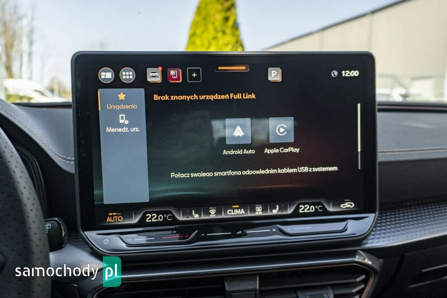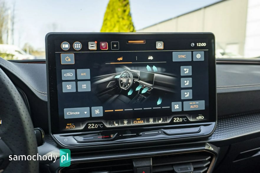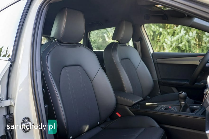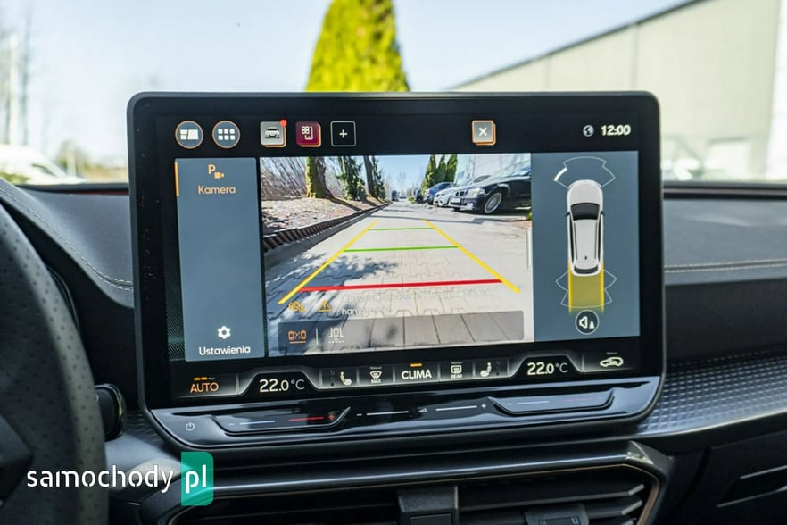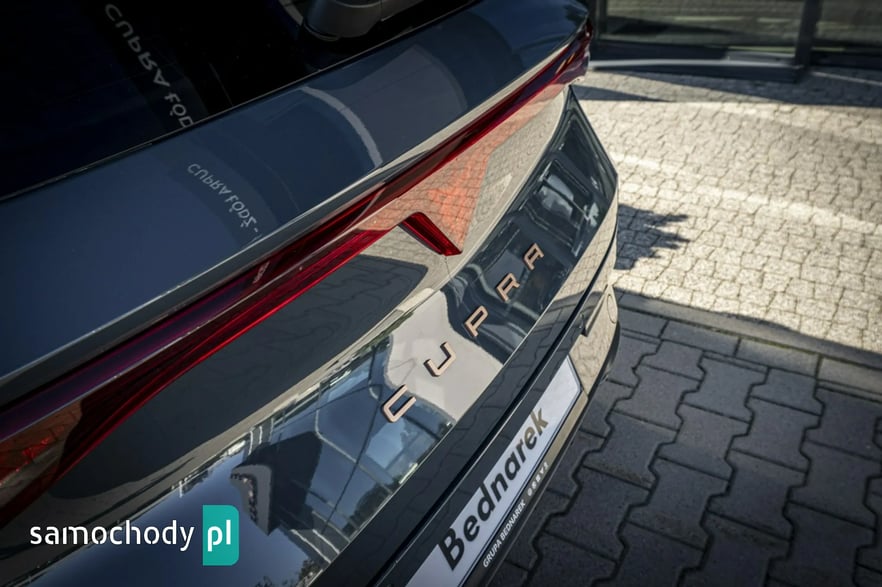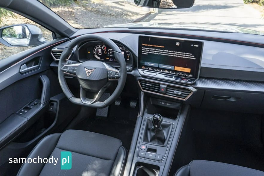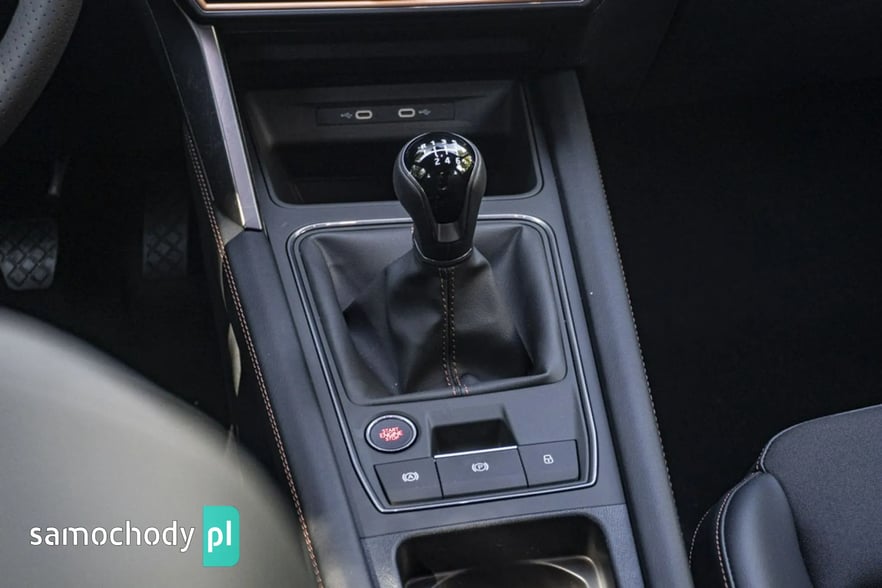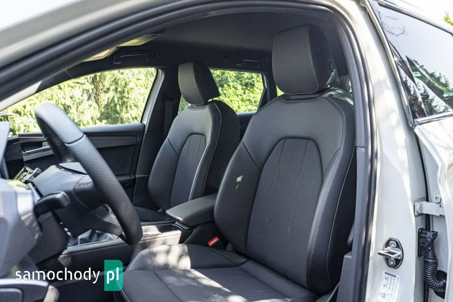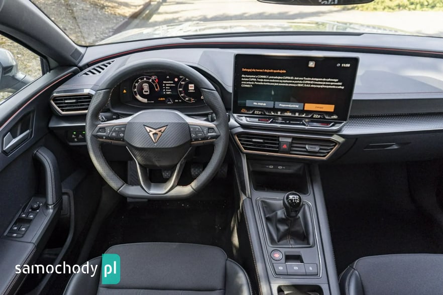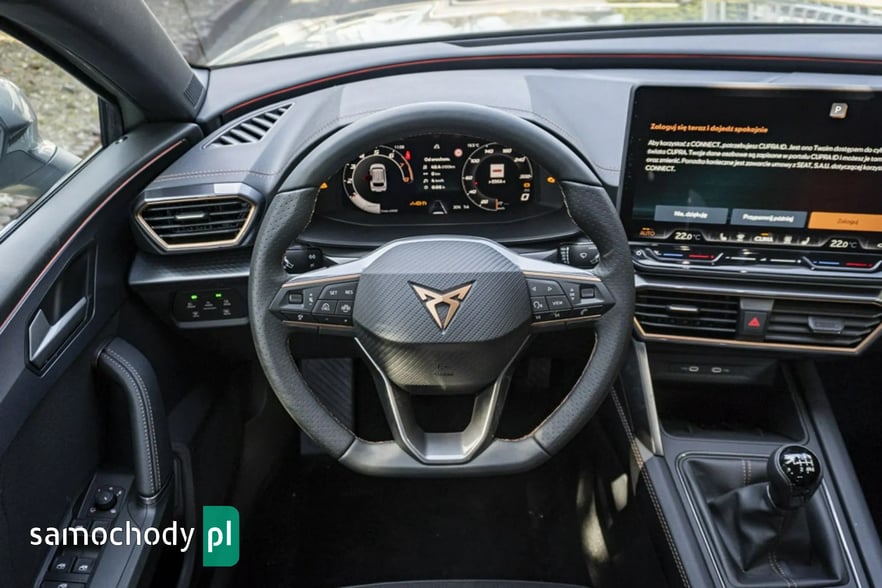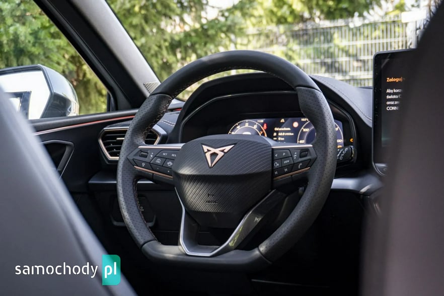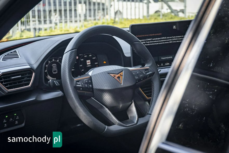 • Sportowa, podgrzewana kierownica wielofunkcyjna z łopatkami obszyta skórą z przyciskiem trybu Cupra i przyciskiem uruchamiania silnika