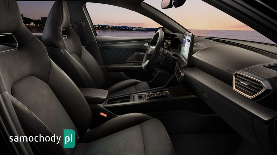 • Sportowa, podgrzewana kierownica wielofunkcyjna z łopatkami obszyta skórą z przyciskiem trybu Cupra i przyciskiem uruchamiania silnika