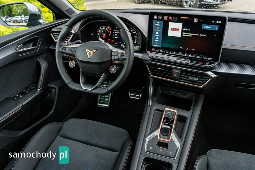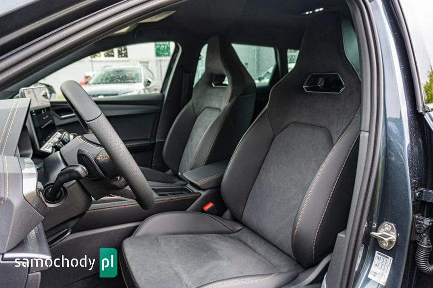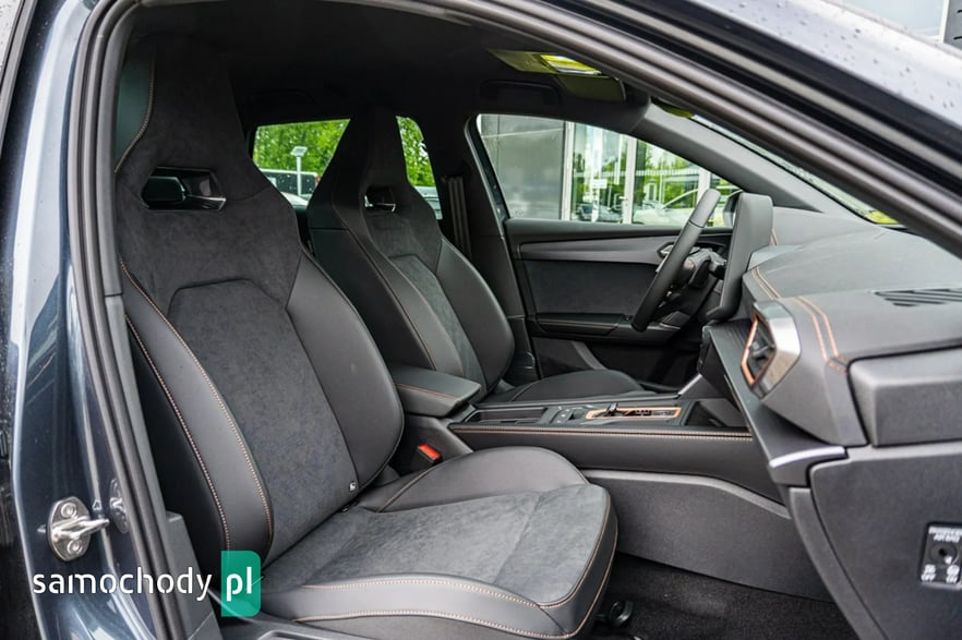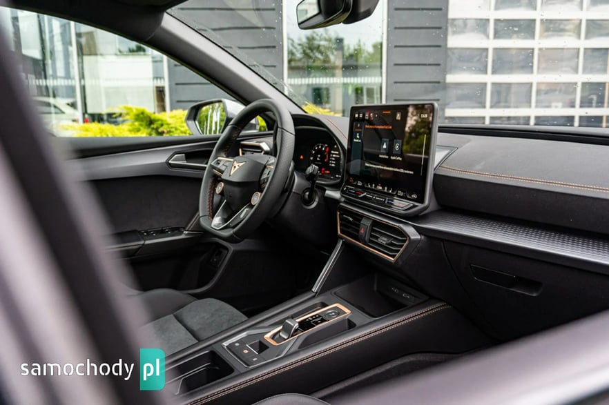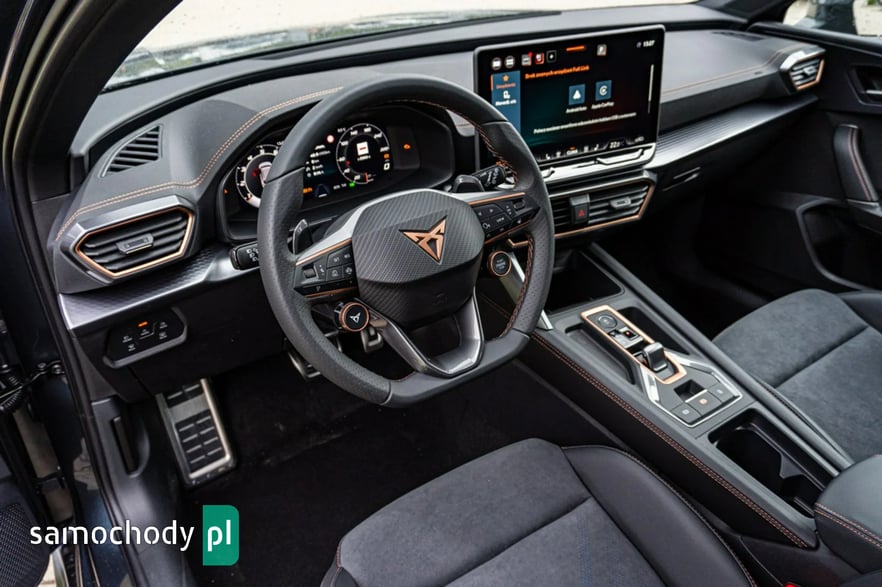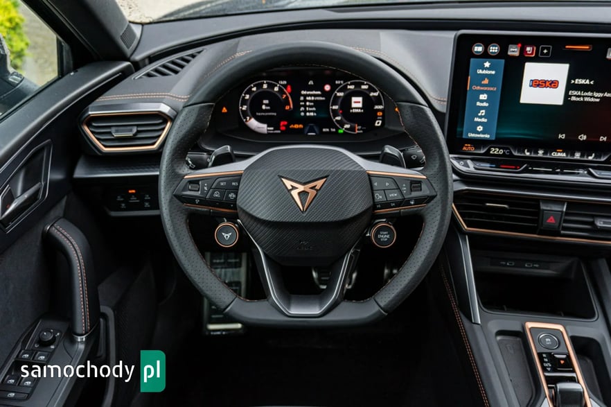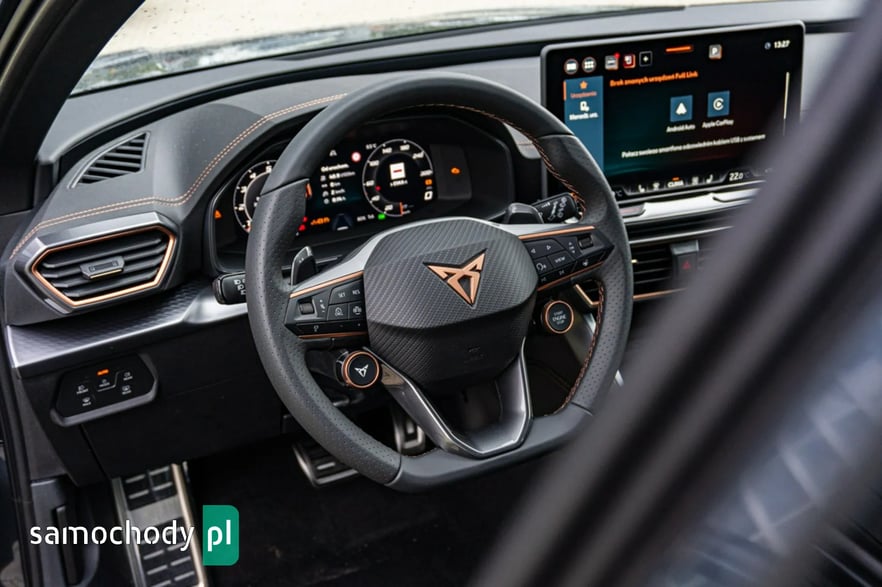 • Sportowa, podgrzewana kierownica wielofunkcyjna z łopatkami obszyta skórą z przyciskiem trybu Cupra i przyciskiem uruchamiania silnika