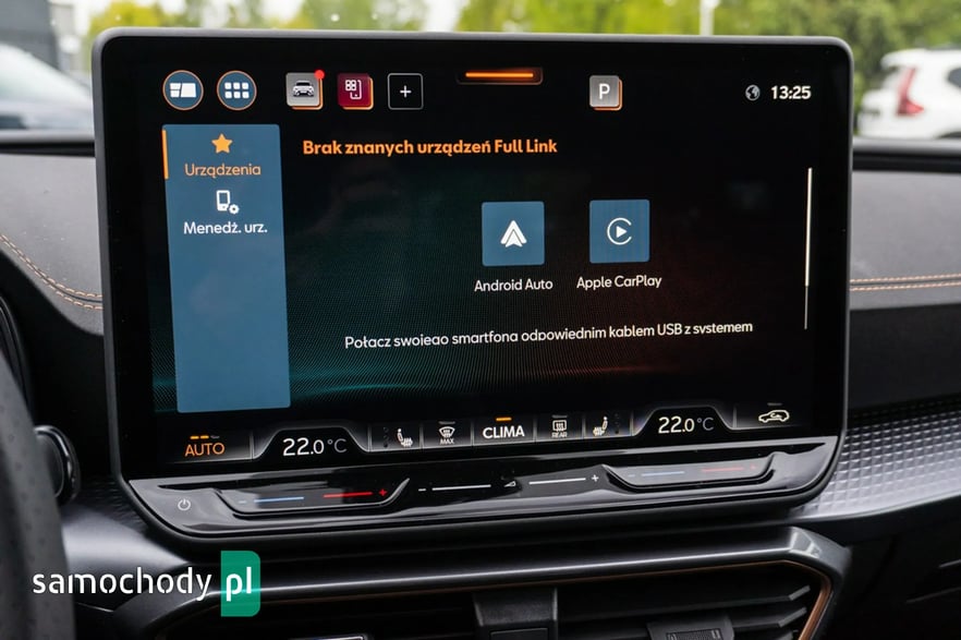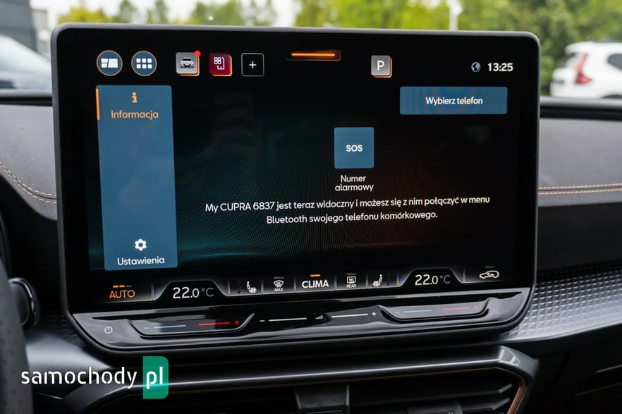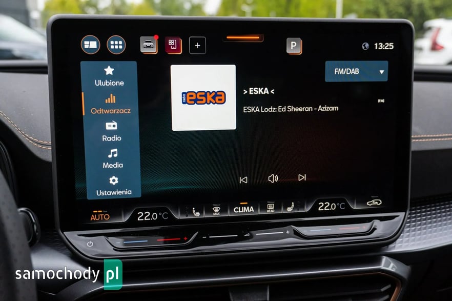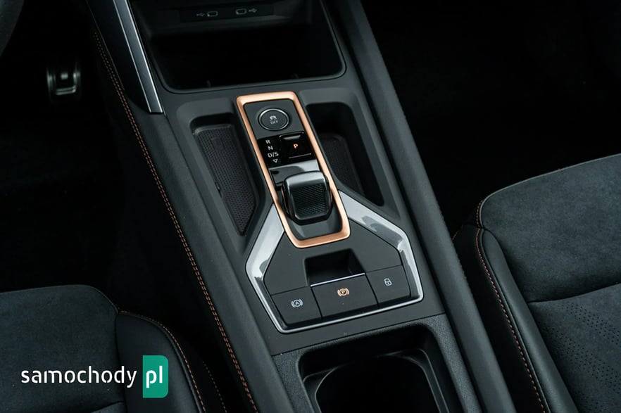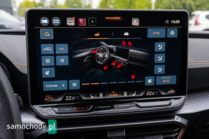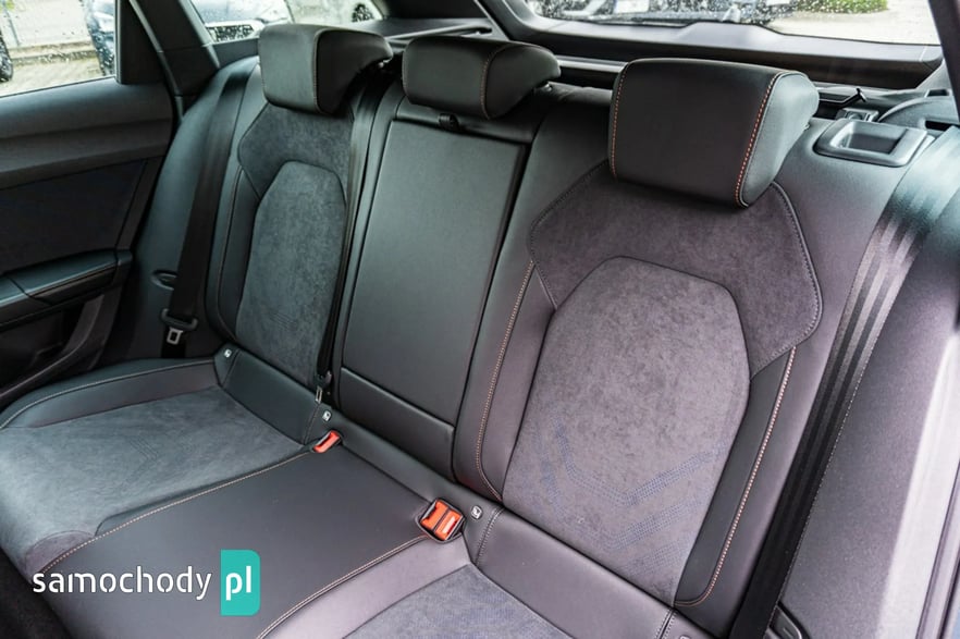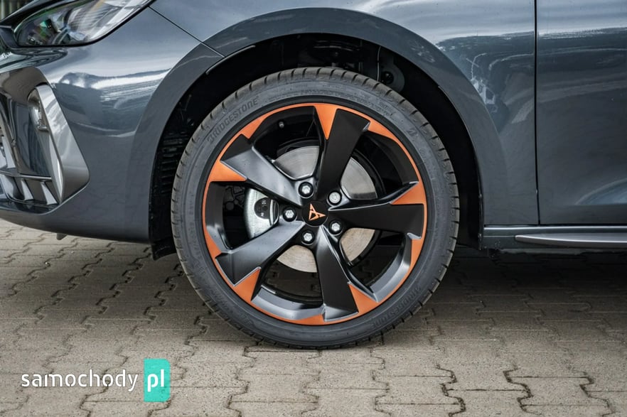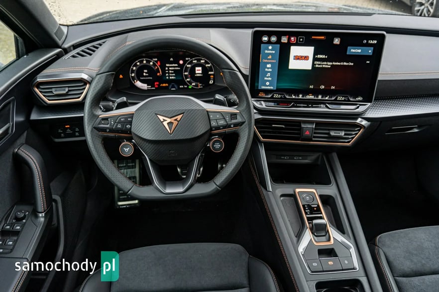 • Sportowa, podgrzewana kierownica wielofunkcyjna z łopatkami obszyta skórą z przyciskiem trybu Cupra i przyciskiem uruchamiania silnika