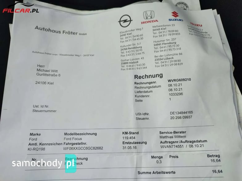Poliftowy Ford Focus wyprodukowany w 2016 roku z silnikiem benzynowym o mocy 100 koni mechanicznych. 100% oryginalny, udokumentowany przebieg 128 tysięcy kilometrów, potwierdzony książką serwisową, niemieckimi fakturami i badaniami technicznymi oraz bazą danych CEPIK. Samochód utrzymany w bardzo dobrym stanie technicznym i wizualnym. Wnętrze czyste i zadbane. Silnik, skrzynia biegów, zawieszenie oraz wszystkie podzespoły pracują bez zarzutu. Prowadzi się pewnie i komfortowo. Możliwość sprawdzenia pojazdu na stacji diagnostycznej. Zapraszamy na oględziny i jazdę próbną!
