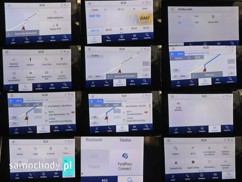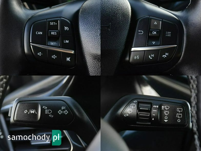 ABS, Android Auto, Apple CarPlay, Interfejs Google Car Play, Lane Assist - kontrola zmiany pasa ruchu, aktywne rozpoznawanie znaków ograniczenia prędkości, asystent świateł drogowych, automatyczne światła, bluetooth, czujnik deszczu i zmierzchu, czujniki ciśnienia w oponach, czujniki parkowania - tył, dźwignia zmiany biegów wykończona skórą, ekran dotykowy, elektryczne lusterka (regulowane, składane, podgrzewane, podświetlane), elektryczne szyby przednie i tylne, felgi: stalowe, gniazdo USB x2, immobiliser, kierownica (wielofunkcyjna, ze sterowaniem radia, regulowana, obszyta skórą) klimatyzacja: ręczna, klimatyzowany schowek, komputer pokładowy, kontrola trakcji (ASR), lampy (do jazdy dziennej, przeciwmgielne, przednie oraz tylne) w technologii LED, liczba poduszek: 6, nawigacja satelitarna, ogranicznik prędkości, opony: wielosezonowe, oświetlenie drogi do domu, podgrzewana tylna szyba, poduszki powietrzne: (kierowcy, pasażera, boczne przód, kurtynowe przód), podłokietniki - przód, reflektory adaptacyjne ledowe skręcające na zakrętach, regulacja wysokości fotela, stabilizacja toru jazdy (ESP) z zmiennym trybem: (normalny, eko, sportowy, śliska nawierzchnia, droga nieutwardzona), system głośnomówiący, system powiadamiania o wypadku, system rozpoznawania znaków drogowych, system start-stop, system sterowania głosem, system wspomagania hamowania, tempomat, uchwyt ISOFIX, wspomaganie kierownicy, wspomaganie ruszania na wzniesieniu, wyjście aux, zestaw głośnomówiący, zintegrowany hotspot WiFi, światła do jazdy dziennej, aktywny asystent hamowania awaryjnego, asystent hamowania - Brake Assist, ostrzeżenie o jeździe pod prąd, system ostrzegania przed kolizją, wykrywanie zmęczenia kierowcy, fotele sportowe, spoiler, FordPass Connect z modemem GSM, dywaniki welurowe, gaśnica, trójkąt ostrzegawczy, zestaw naprawczy do koła, centralny zamek.