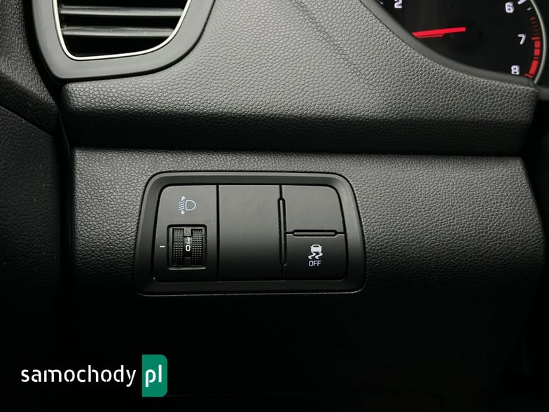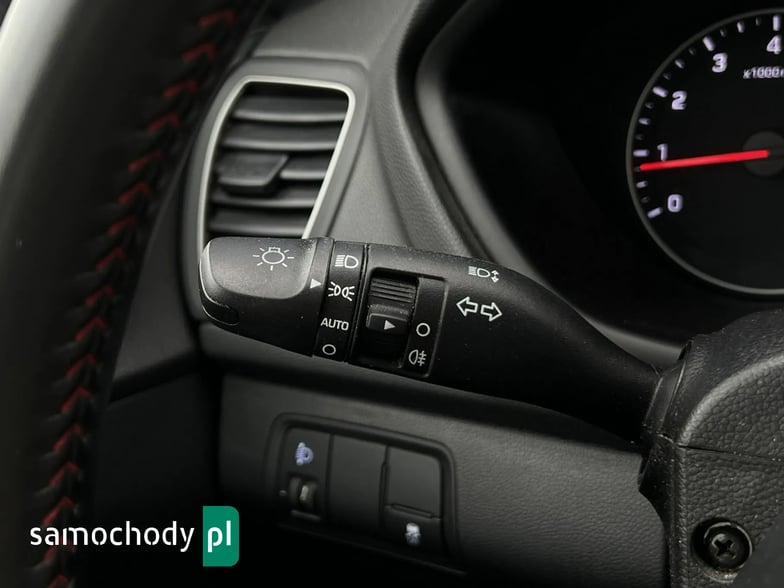 Szybka ładowarka USB, gniazdko 12V, AUX, Radio z dotykowym kolorowym ekranem 7” i kamera cofania, Android Auto/Apple Car Play, System Bluetooth, Tapicerka materiałowa z czerwonym przeszyciem.