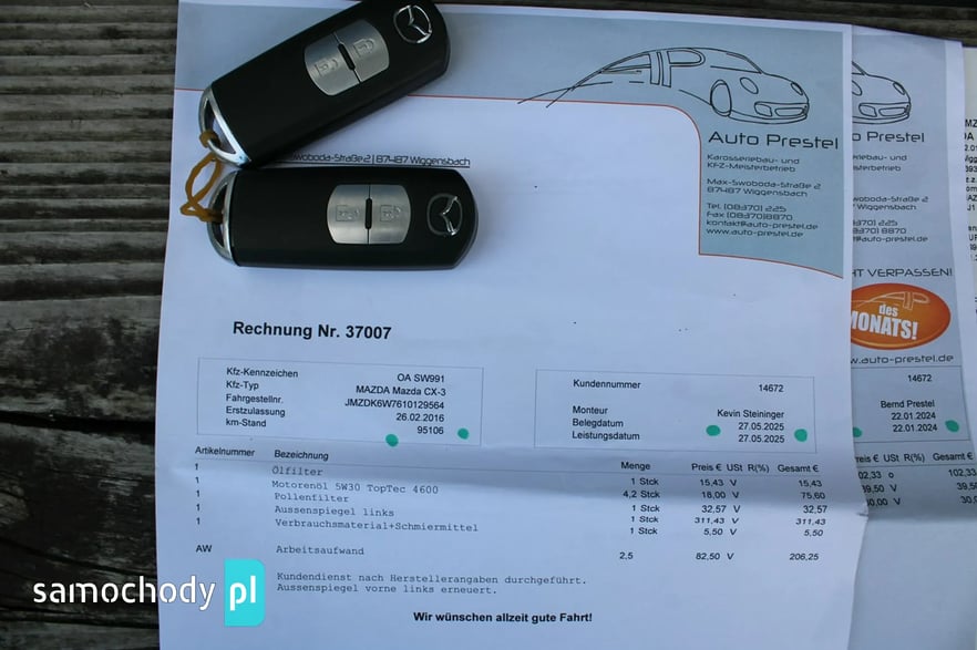 Dlaczego? Bo oferuję Mazdę CX-3 z 2016 roku, sprowadzoną z Niemiec, w 100% bezwypadkową, z oryginalnym lakierem i w pełni udokumentowanym przebiegiem – tylko 100 000 km.