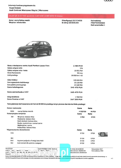 Audi (FY) Q5 quattro 2.0 TDI 140 KW s tronic - z polskiego salonu, rejestracja marzec 2018, napęd na 4 koła, automat, czarny metalik, tapicerka częściowo skórzana jasna, reflektory led, klimatyzacja automatyczna trzystrefowa, pakiet technology i pakiet comfort, koło dojazdowe, pakiet s line exterior, koła 19 cali, nowe opony letnie i zimowe. Przebieg 107 000. Pierwszy właściciel, bezwypadkowe i serwisowane. Pełna specyfikacja na załączonych zdjęciach