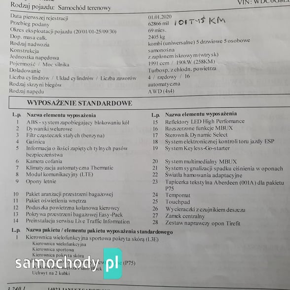 WYPOSAŻENIE STANDARDOWE: ABS, dywaniki welurowe, filtr cząsteczek stałych (benzyna), gaśnica, informacja o ilości zapiętych pasów, kamera cofania, klimatyzacha automatyczna thermatic, LTE, opony letnie, pakiet aranżacji bagażowej przestrzennej, pakiet oświetlenia wnętrza, poduszki powietrzne, pokrywa przestrzeni bagażowej Easy-Pack, Live Traffic Information, Reflektory LED, rozszerzone funkcje sys.multimedialnego MBUX, sterownik dynamic Select, ESP, Keyless-Go-starter, kontrola ciśnienia w oponach, światła hamowania adaptacyjne, tapicerka tekstylna Aberdeen P75, tempomat, Touchpad, czujnik deszczu, zamek centralny, zestaw naprawczy opon Tirefit, kieronica wielofunkcyjna, sportowa, pokryta skórą, 2 uchwyty na kubki, wykończenie Piano Black.