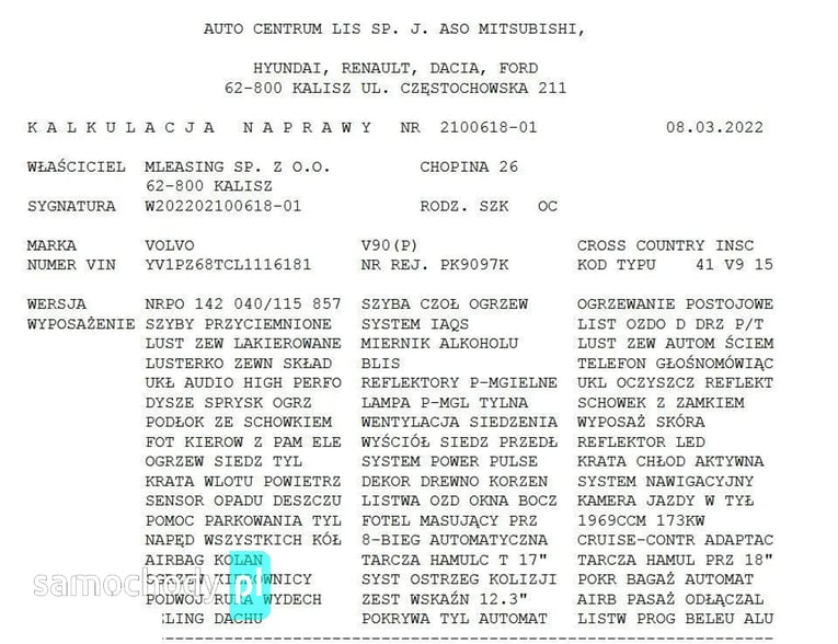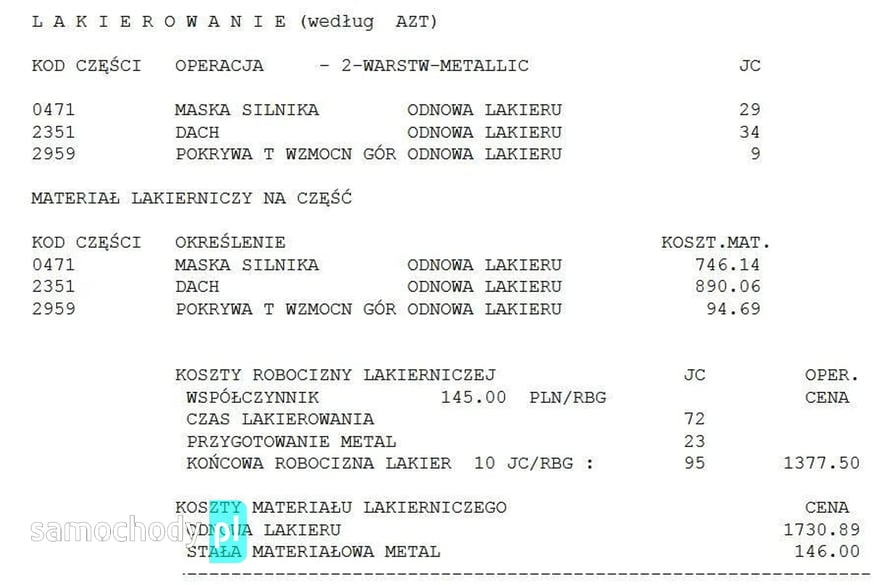 W 2022 r. miała miejsce szkoda garażowa. W czasie zakładania fotovoltaiki -nawiercania dachu budynku, w którym stał samochów na jego dach i maskę spadły okruch tynku i spowodowały 4 odpryski na dachu i zarysowanie na masce (widoczne na zdjęciach). Te 2 elementy zostały pomalowane w autoryzowanym salonie, zdjęcia z malowania i kosztorys powyżej.