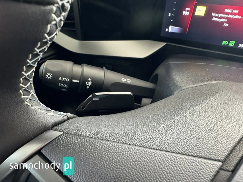 Sportowe koło kierownicy pokryte skórą ekologiczną, spłaszczone u dołu, z przyciskami sterowania