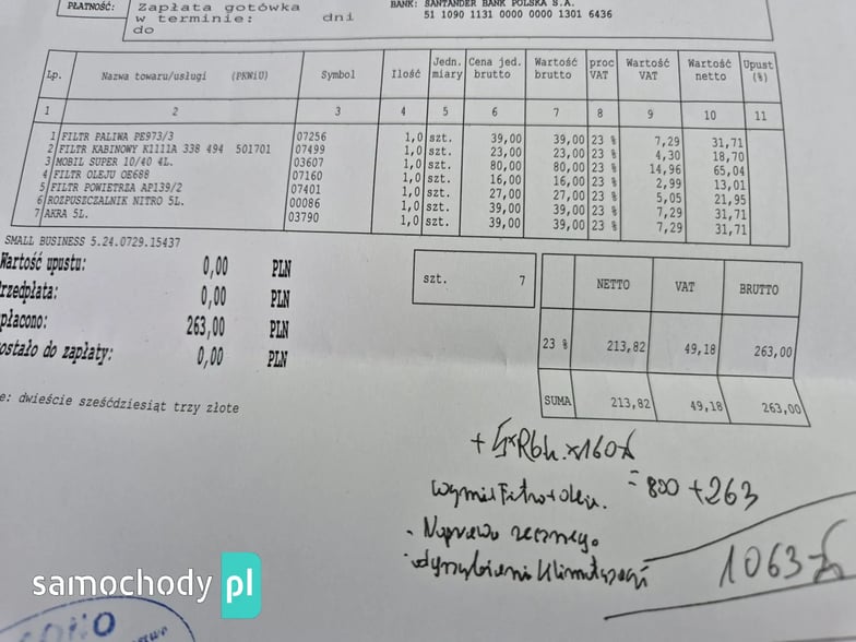 Wykonaliśmy przegląd serwisowy przedsprzedażowy nowe wszystkie filtry olej serwis klimatyzacji