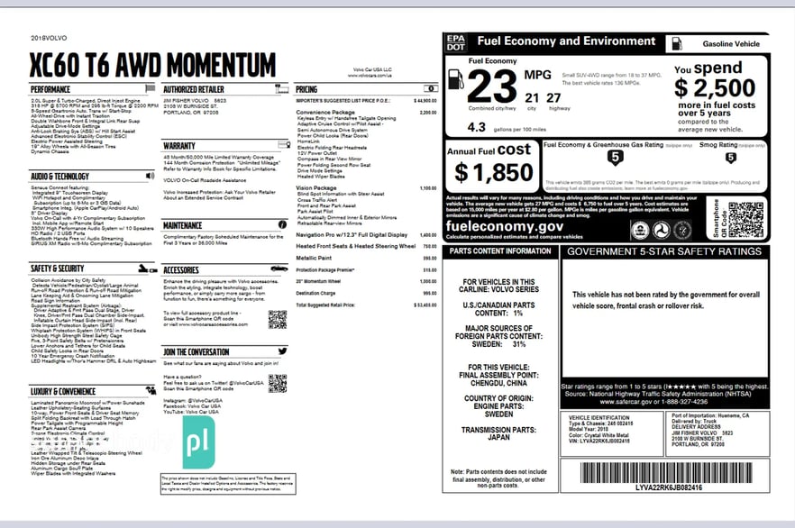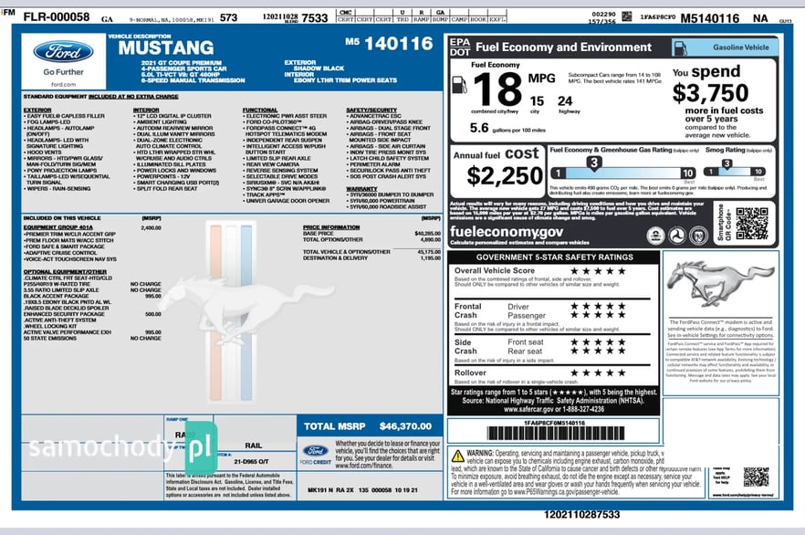 Wyposażenie Window Sticker Auta z USA & Kanada